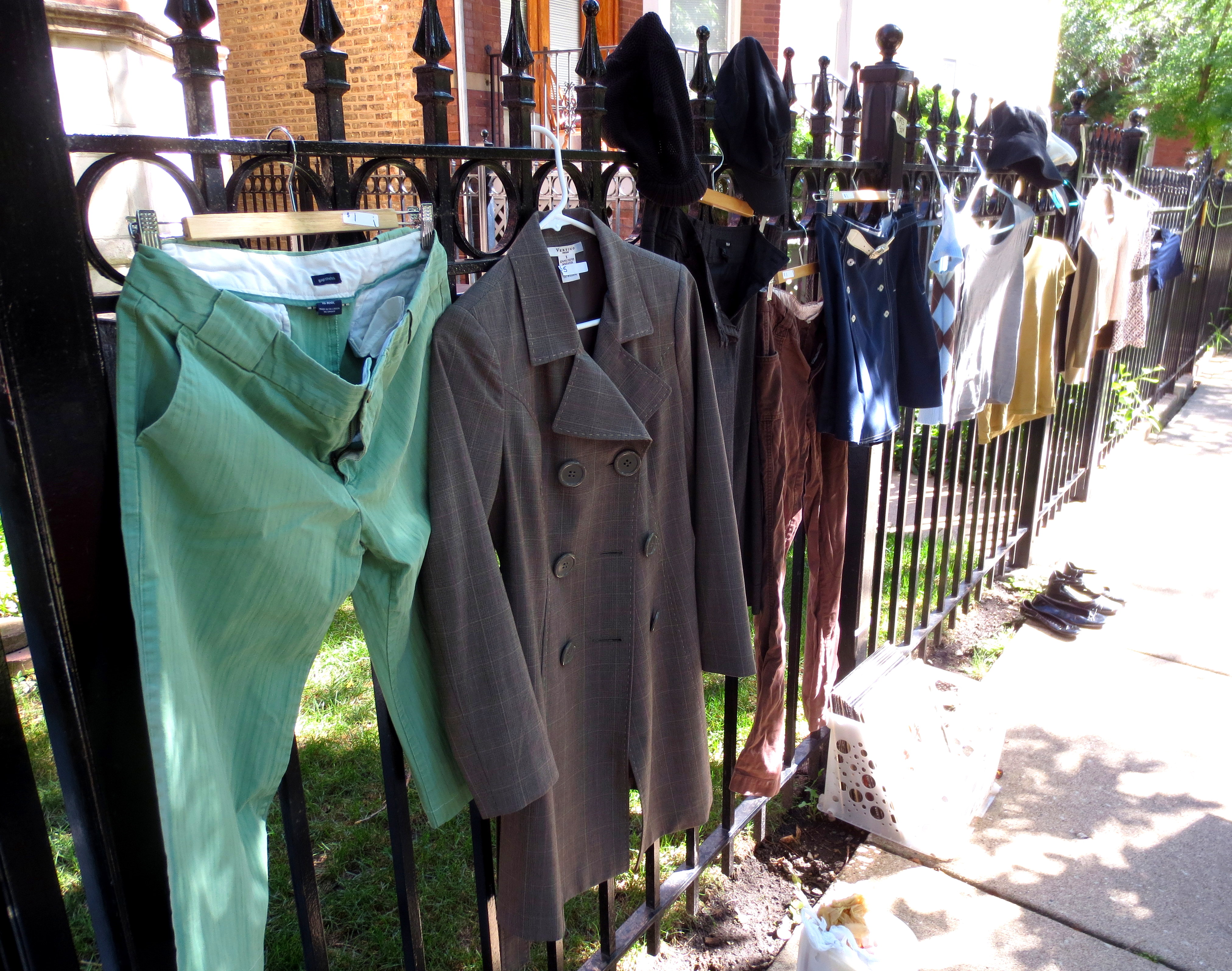STAGE YOUR SALE: Is your sale easy to find? We held ours on the sidewalk and parkway, so that innocent pedestrians had to squeeze past our bargains to get to the end of the block. We hung the better garments on the fence so that passers-by were forced to make eye contact with the ghostly remnants of my pre-baby, mid 2000s business casual wardrobe.