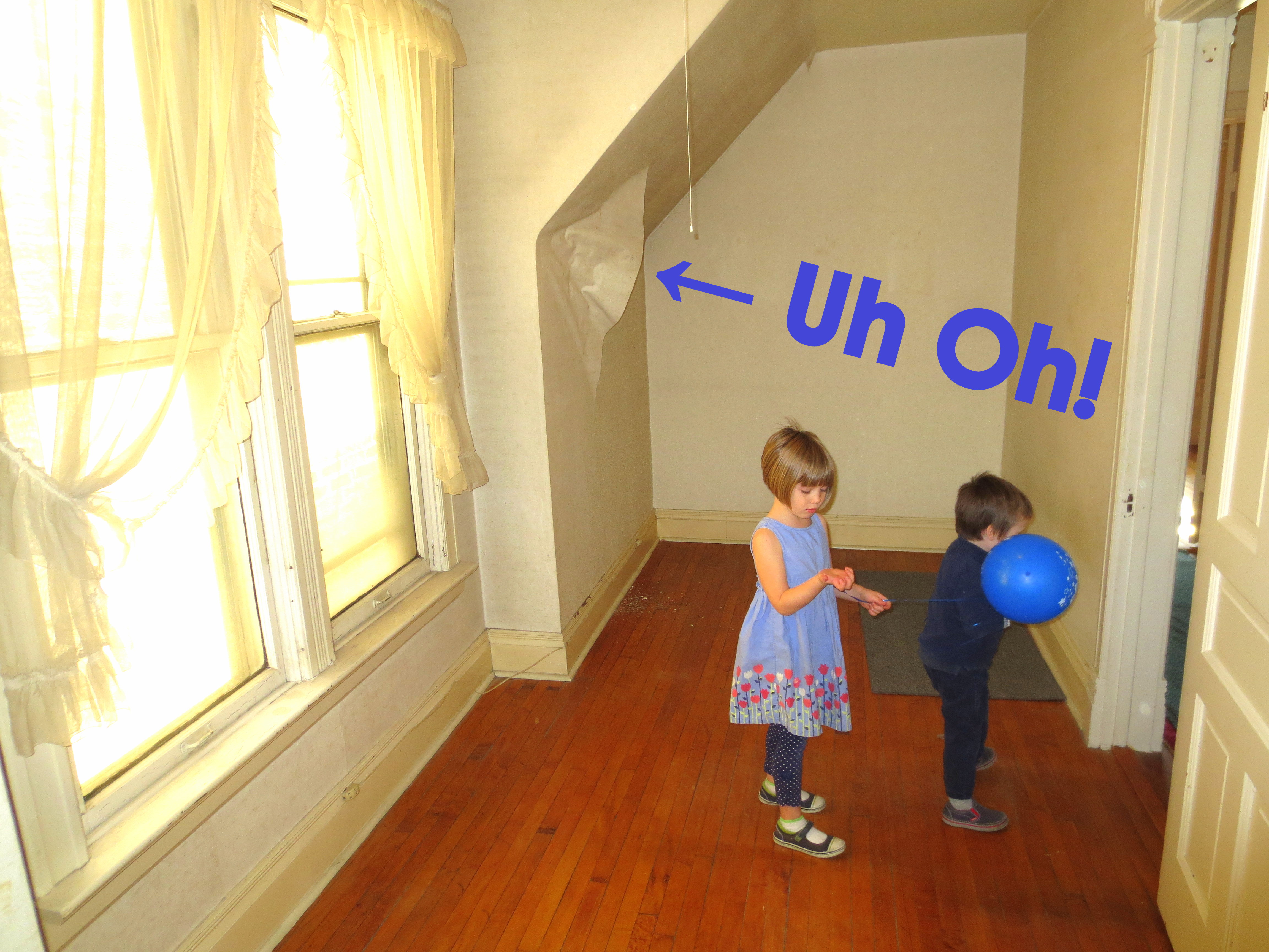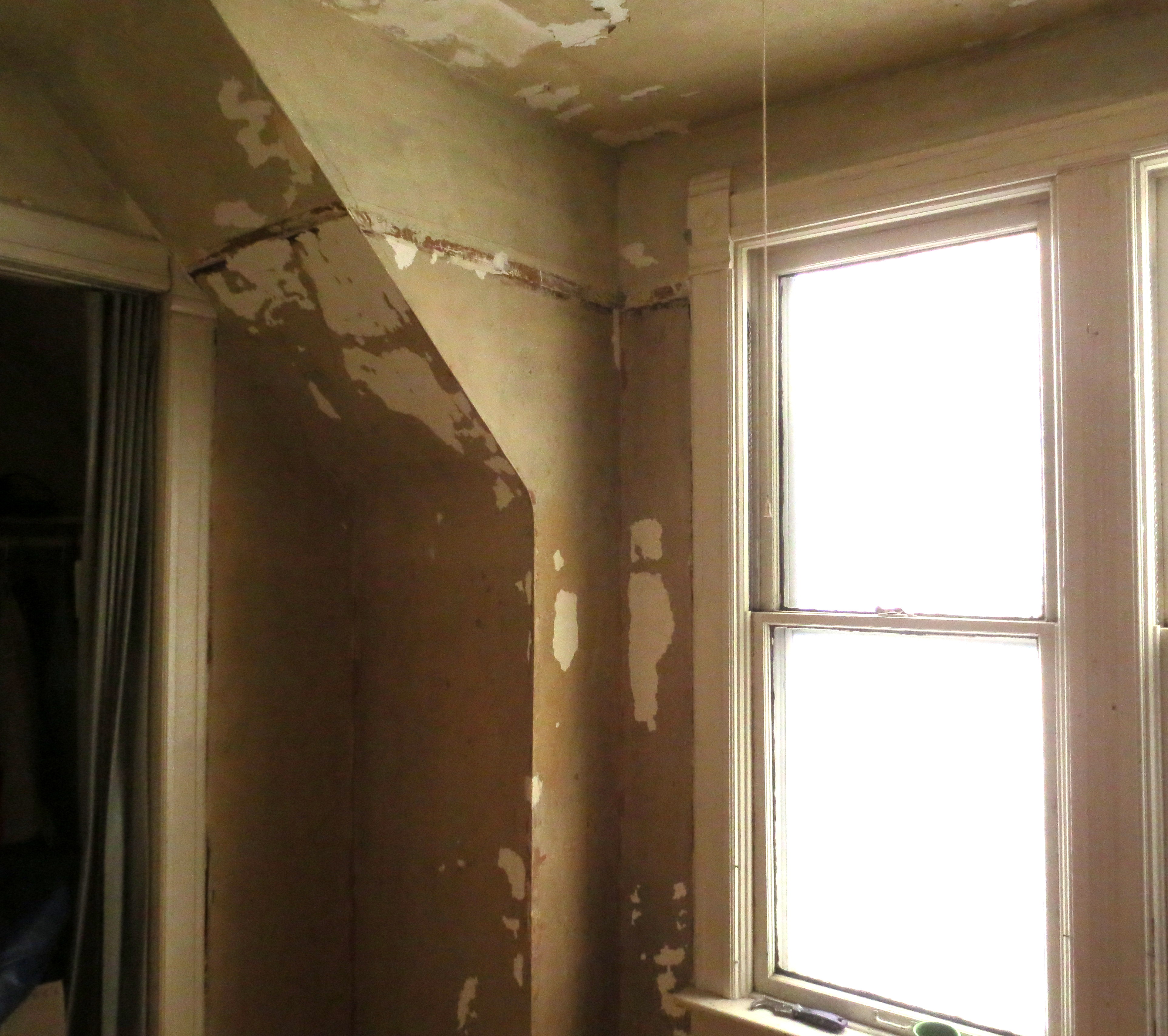You may recall from our first house tour that the future bedroom of Max (age 14) had an unsettling bulge in the wallpaper: