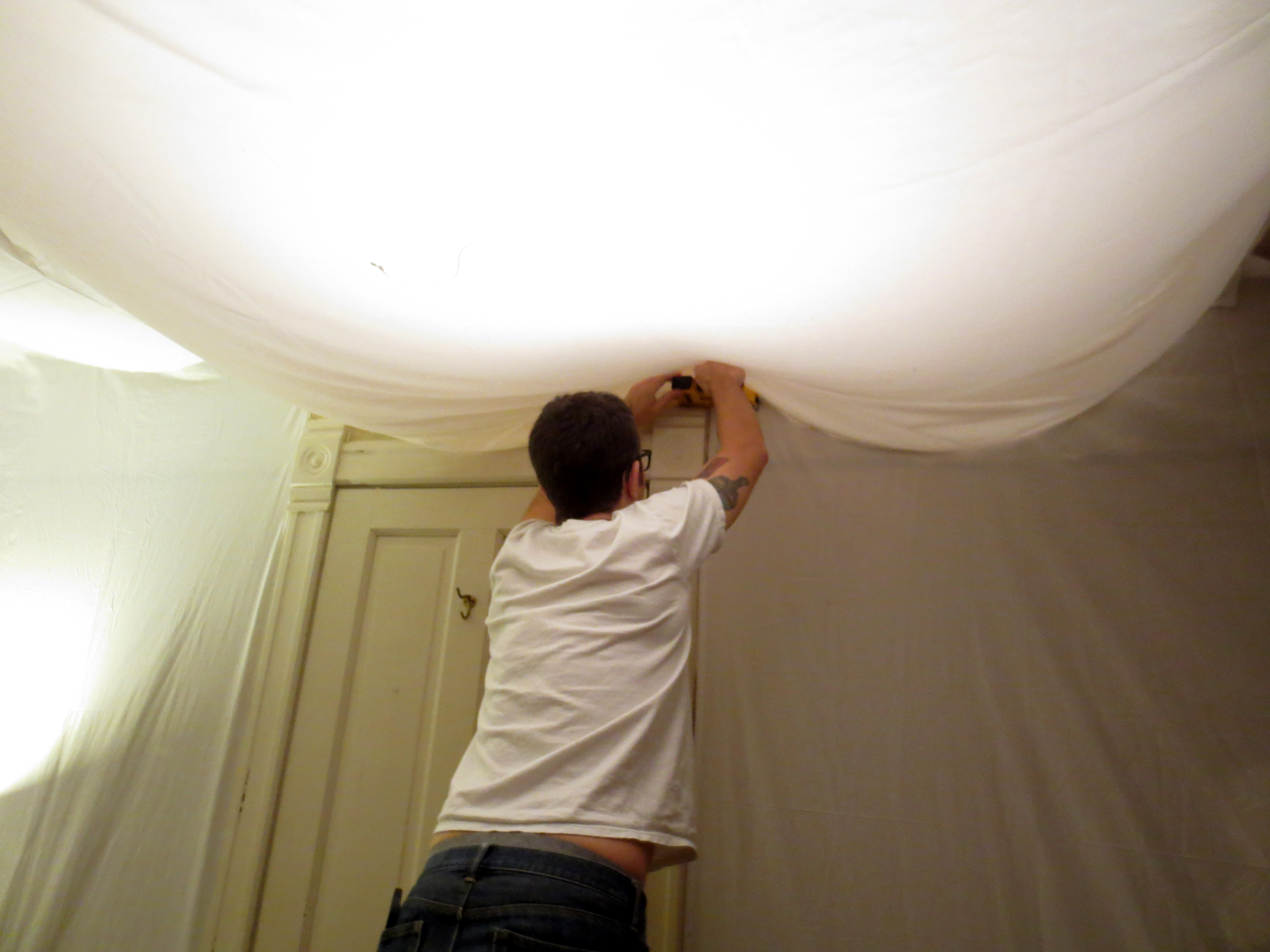 STEP 3 – HANG THE CEILING: This is the step that, if done correctly, will transform your space from a refugee camp into dreamlike, billowy marshmallow. Starting in the middle of the room, staple the end of one sheet to the wall, a few inches below the ceiling. Drape the sheet across to the parallel wall and staple on the other side.
