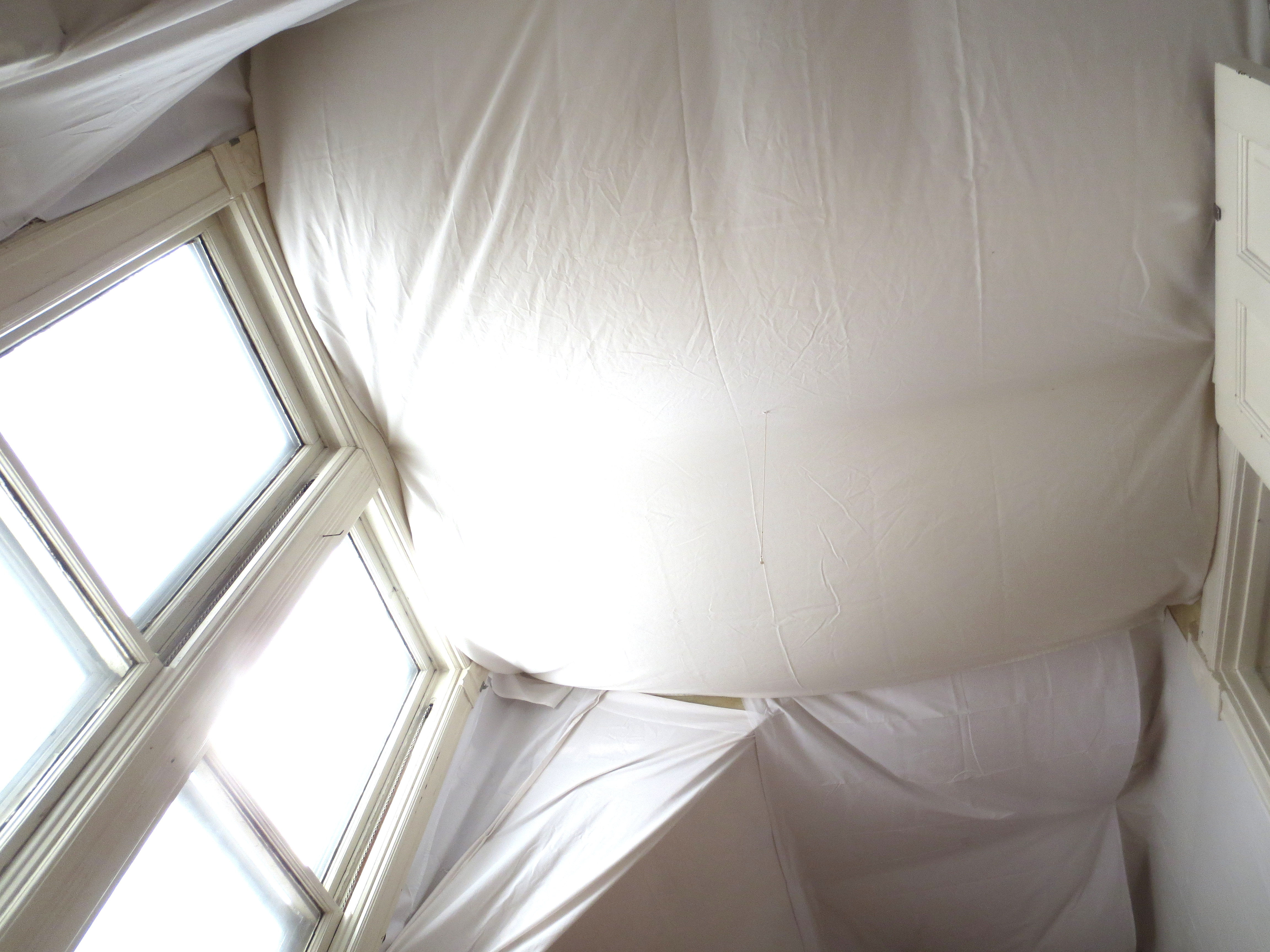 You may also have a ceiling-mounted light fixture to deal with, and I strongly suggest that you drape the sheets over the fixture for great light diffusion – like a full moon on an overcast Spring night, or a smoggy sunrise in L.A. Ours was particularly tricky because of an old string pull. After we secured the sheet, I snipped a tiny hole for the string to fall through: