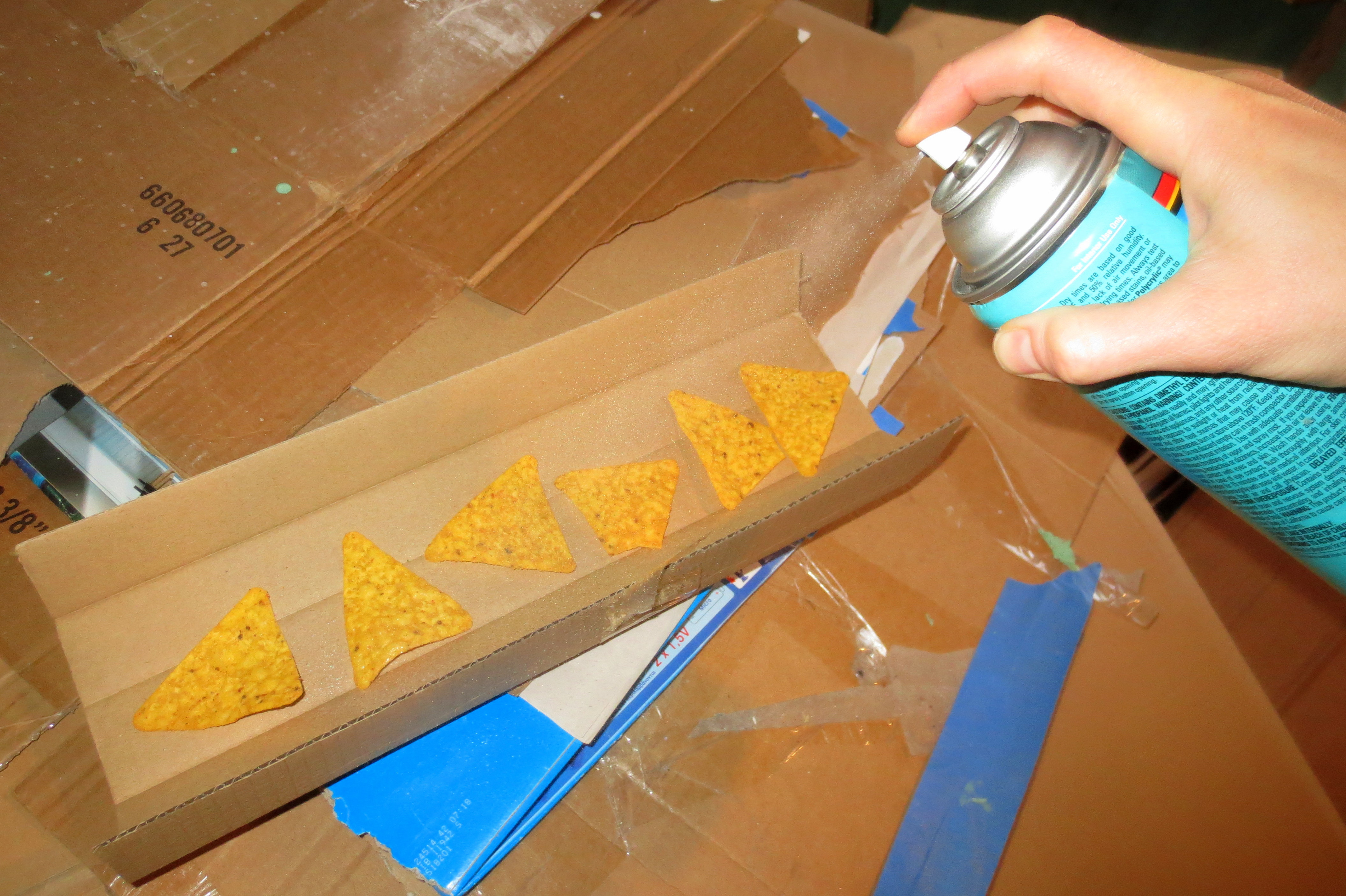While the can of polycrylic is still shook up, arrange about 5 or 6 doritos on another box and spray the front of the chips. When they’re mostly dry to the touch, flip them over and spray the other side. Again, don’t let them get stuck to the box – give a little shake after a few minutes of dry time.