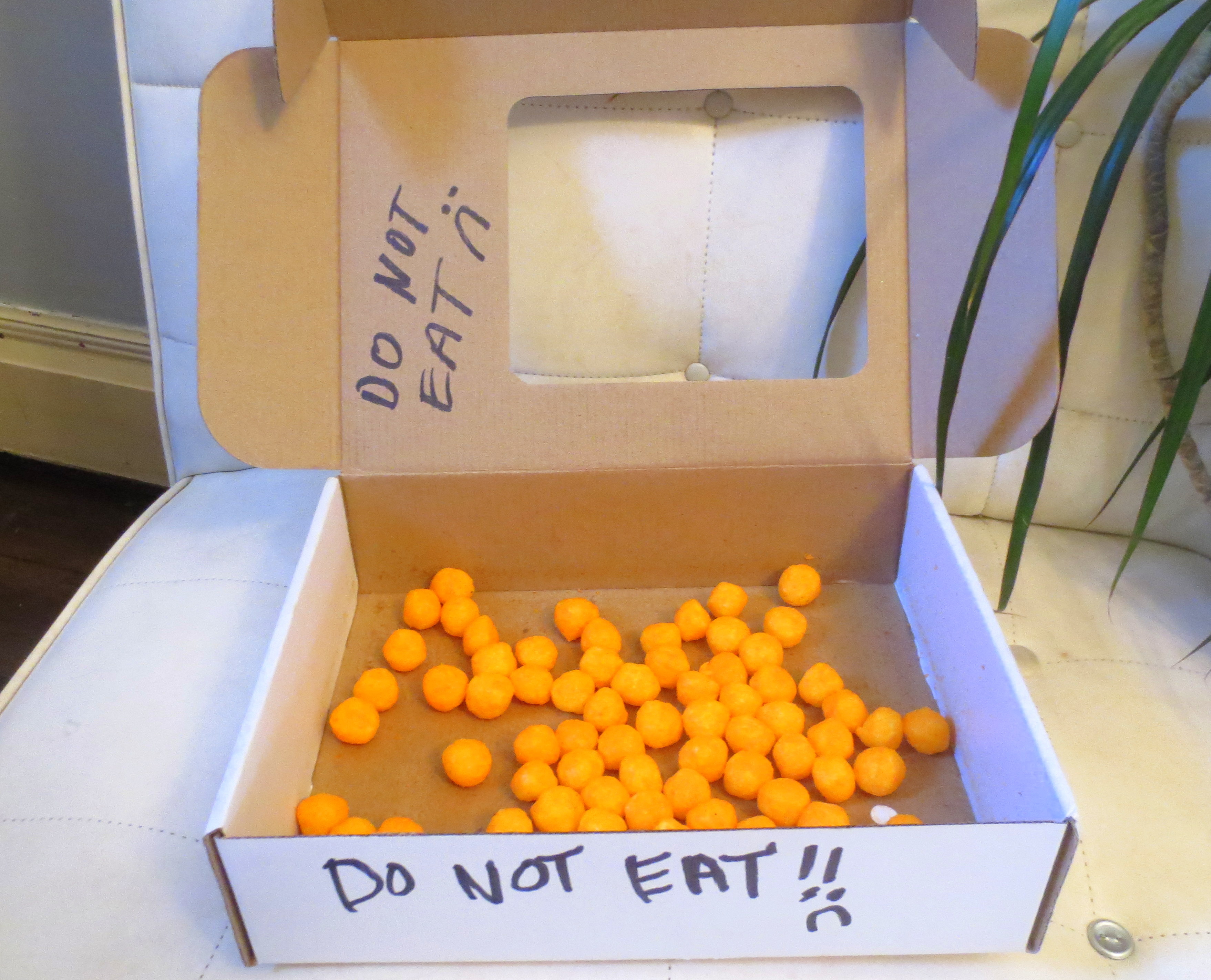 Pour a small pile of cheese balls into a box. With one hand, jiggle the box so that the balls roll around, and use the other hand to apply a continuous spray of polycryclic. After drying for a couple of minutes, jiggle the box a little more so that the balls don’t stick to the cardboard. Repeat two or three more times until the balls feel sufficiently stiff and plasticky.