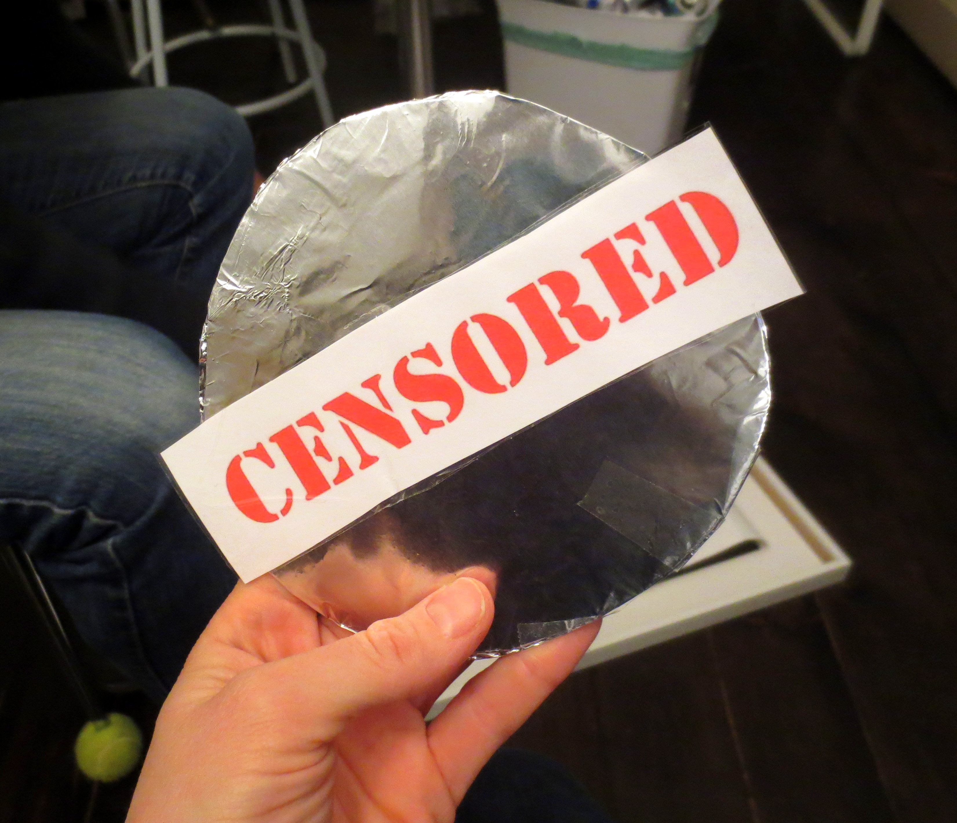 Do a Google image search for “Censored” and print out one of the first five results. Do not look beyond the first five results. Coat your “censored” printout with packing tape, and use glue or tape to stick it to your silver medal.