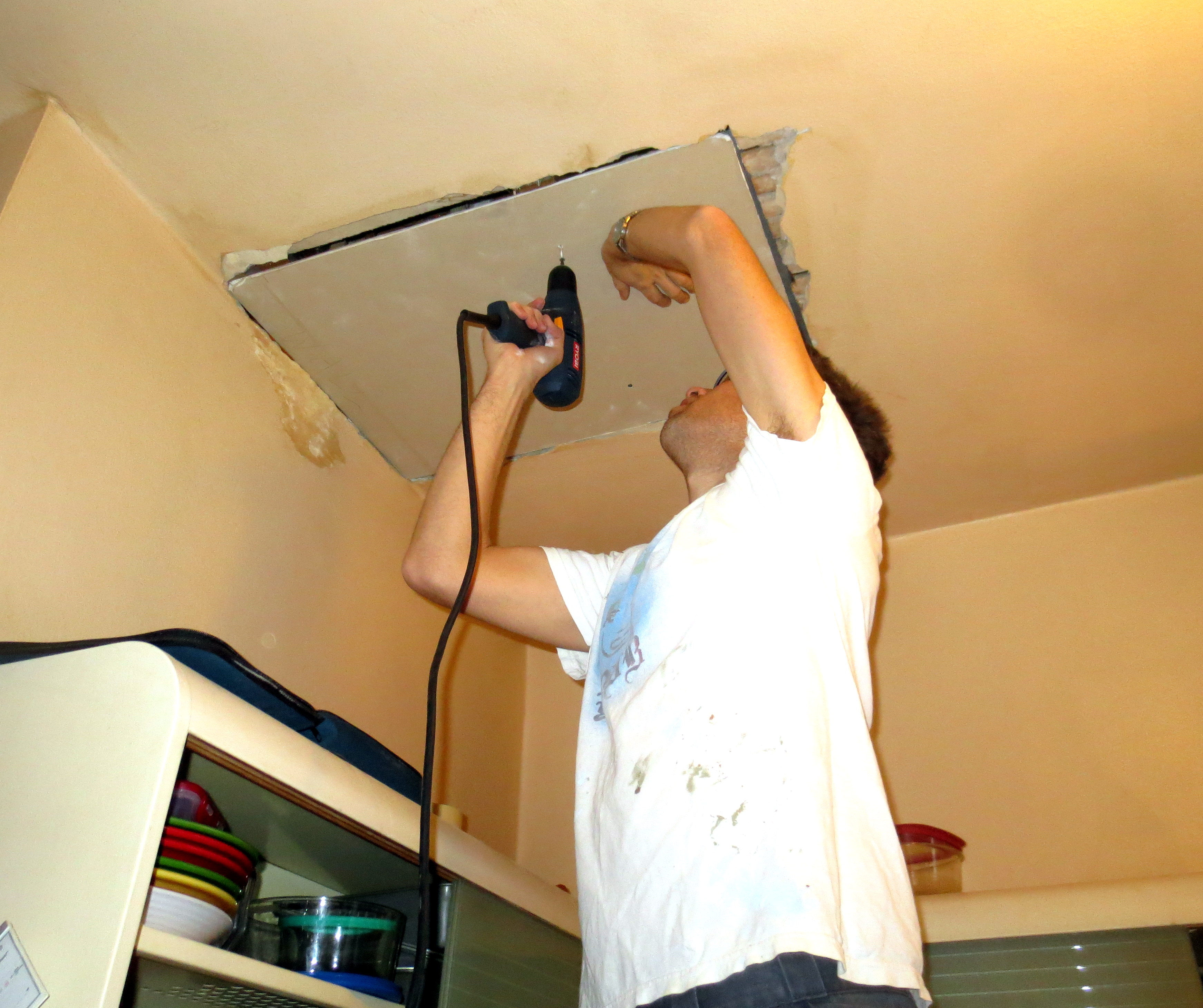 But first, a wee bit of destruction (my favorite!) — removing the mysterious wooden rail that ran along the entire perimeter of the kitchen, about 5 feet up.  The rail put up a good fight against my chisel and crowbar; I’m not sure it was a fair fight, since the rail had 4 coats of paint to defend itself, plus scary 3-inch nails holding it in place. IMG_5644 The euphoria of victory wore off when I realized I’d need to apply 5 coats of joint compound to hide the wall canal I left behind.  Nothing I can’t survive with a comfy pair of sweatpants and 12 continuous hours of podcasts. IMG_5651Meanwhile, Scott drilled a square of drywall over a mysterious hole in the kitchen ceiling, probably caused by the formerly leaking upstairs toilet. The toilet leaking into the kitchen. Think about that for a moment. IMG_5648While Scott was up there, I handed him bucket of TSP solution so he could wash 50 years of kitchen grease off the ceiling and upper walls: IMG_5451PRO-TIP: When buying a fixer-upper house (especially with high ceilings), make sure you are significantly shorter than your DIY Partner. The taller person always gets stuck hanging drywall into the ceiling, and washing the ceiling, and painting the ceiling, and …. well, you get the idea.