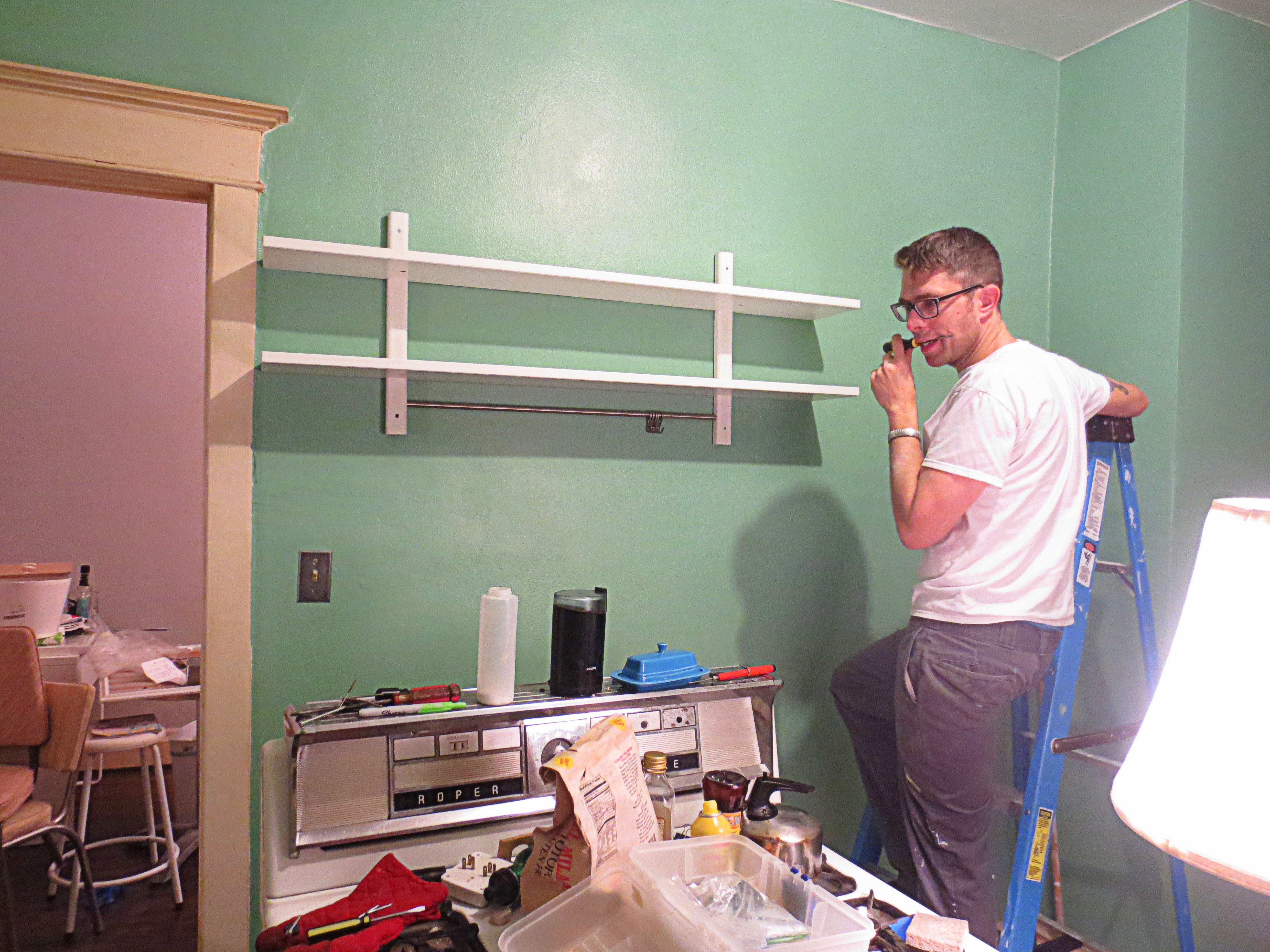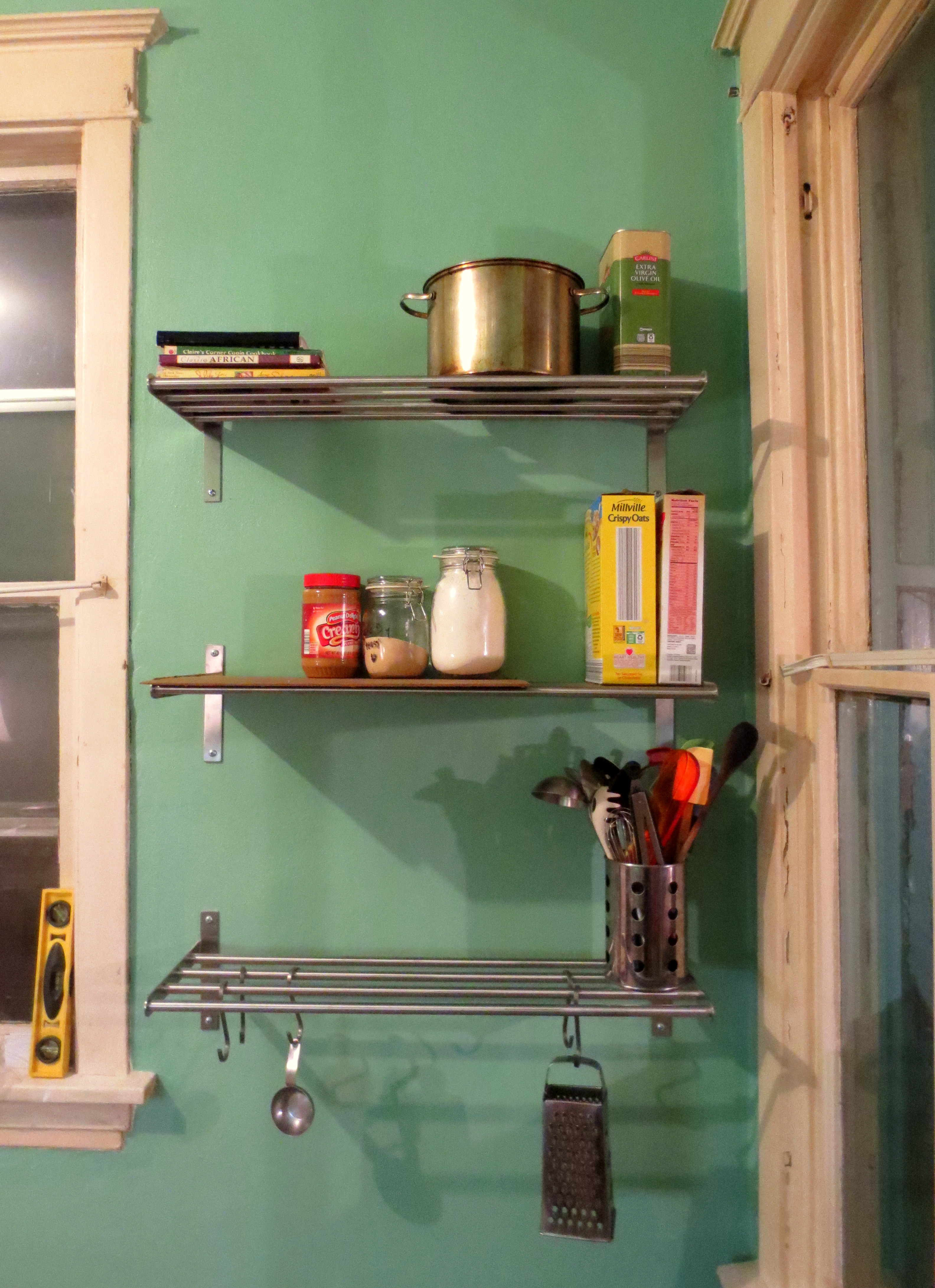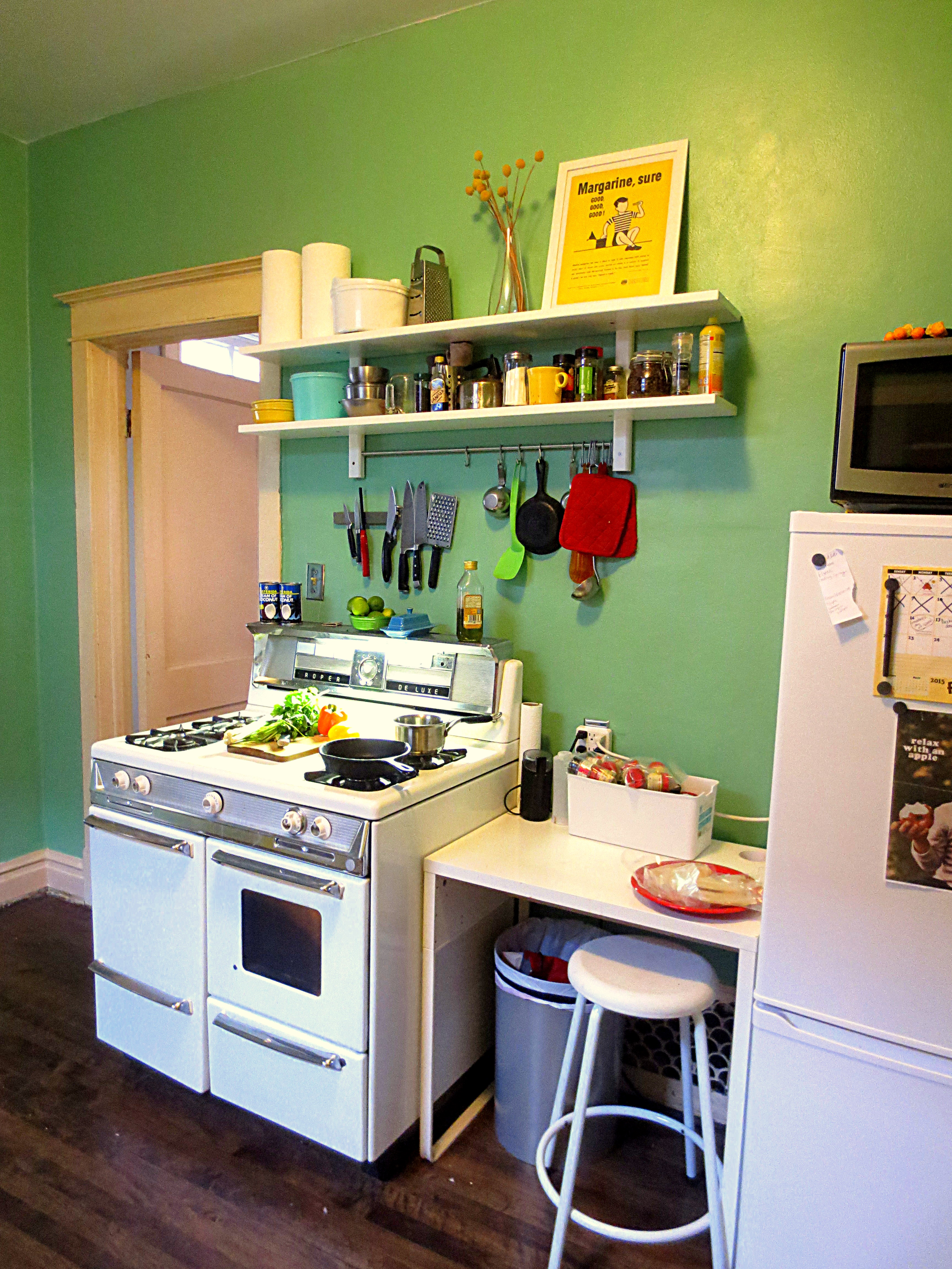 Here’s a closeup of the kitchen wall after what appears to be 50 years of drinking, smoking, hitchhiking, and bar fights* (before and after a TSP scrub): TSP_beforeandafterAfter the big scrub-down, we gave everything a nice coat of white primer.  The next day, we painted the ceiling a crisp white, and the walls the color of my favorite Mid-Century Fiestaware® coffee mug: IMG_5652 IMG_5672When the paint was barely dry, I hung these three IKEA Grundtal wall shelves in the formerly useless corner between the windows (Babushka put her fridge there, blocking the back window). These shelves ain’t pretty, but stainless steel fits effortlessly into any kitchen. More importantly, they’re cheap, lightweight, easy to install, and hold nearly 40 pounds of stuff: IMG_5668Next we hung this lovely white IKEA Varde shelf. In contrast to its Grundtal cousins, the Varde is heavy, awkward and useless, weighing more than it can hold.  But it sure is pretty above our gleaming white 1957 stove: IMG_5673Finally, we mounted a couple of LED light strips under the original cabinets to brighten the sink area. And I dare say that now, we’ve got a mostly functioning kitchen.  Let’s take a tour! Here’s that shelf above the stove, now charmingly cluttered: IMG_5790Until we can figure out something better, we just wedged an old IKEA Micke desk between the stove and the fridge.  The stool we found in the alley behind our last apartment. IMG_5804Note that I was in the middle of making dinner when I snapped these pics, hence all the food preparation that seems to be going on.  The light just seemed right.  IMG_5810If we swing around to the other wall, you’ll see that my beloved Upcycled Recycling Center has finally found a home in the Babuska kitchen! Traveling along the west wall, you’ll see that there’s enough free space for a “breakfast nook” — our patio table, plus the two pink chairs that Babushka left behind. Note that since the coffee cups match the wall, they virtually disappear in your hand. For whatever that’s worth: IMG_5792And the old Kelvinator Kabients couldn’t be more thrilled to be surrounded by green, picking up the undertones of their glass doors. And that under-cabinet lighting makes dishwashing almost tolerable! IMG_5806IMG_5798(artwork courtesy of Matt Avery/ PSA) IMG_5803We’re pretty happy with our little makeover, which (not counting the floors), cost about $200 total.  The paint color- while period-appropriate– pushed me out of my comfort zone, and I couldn’t be more thrilled.