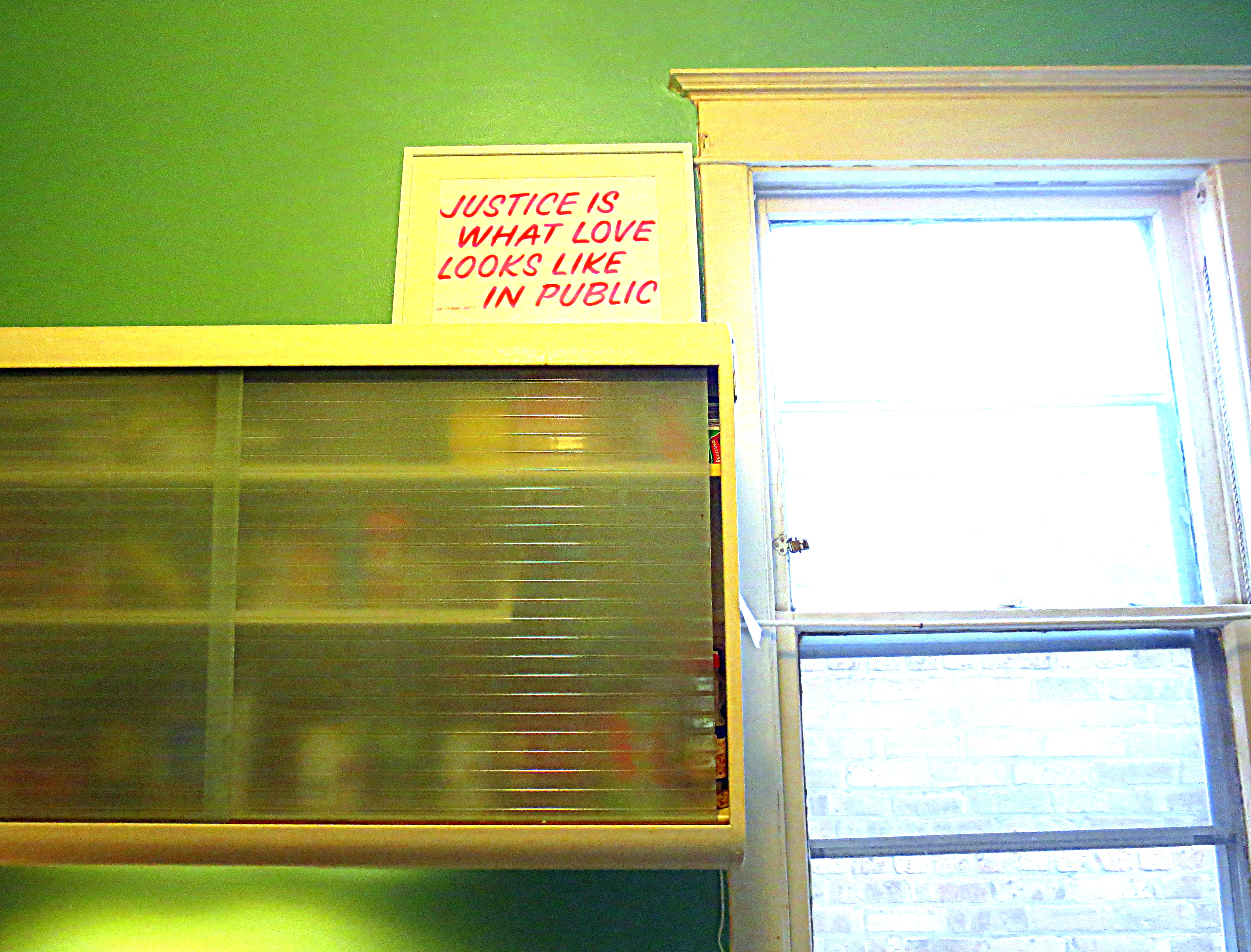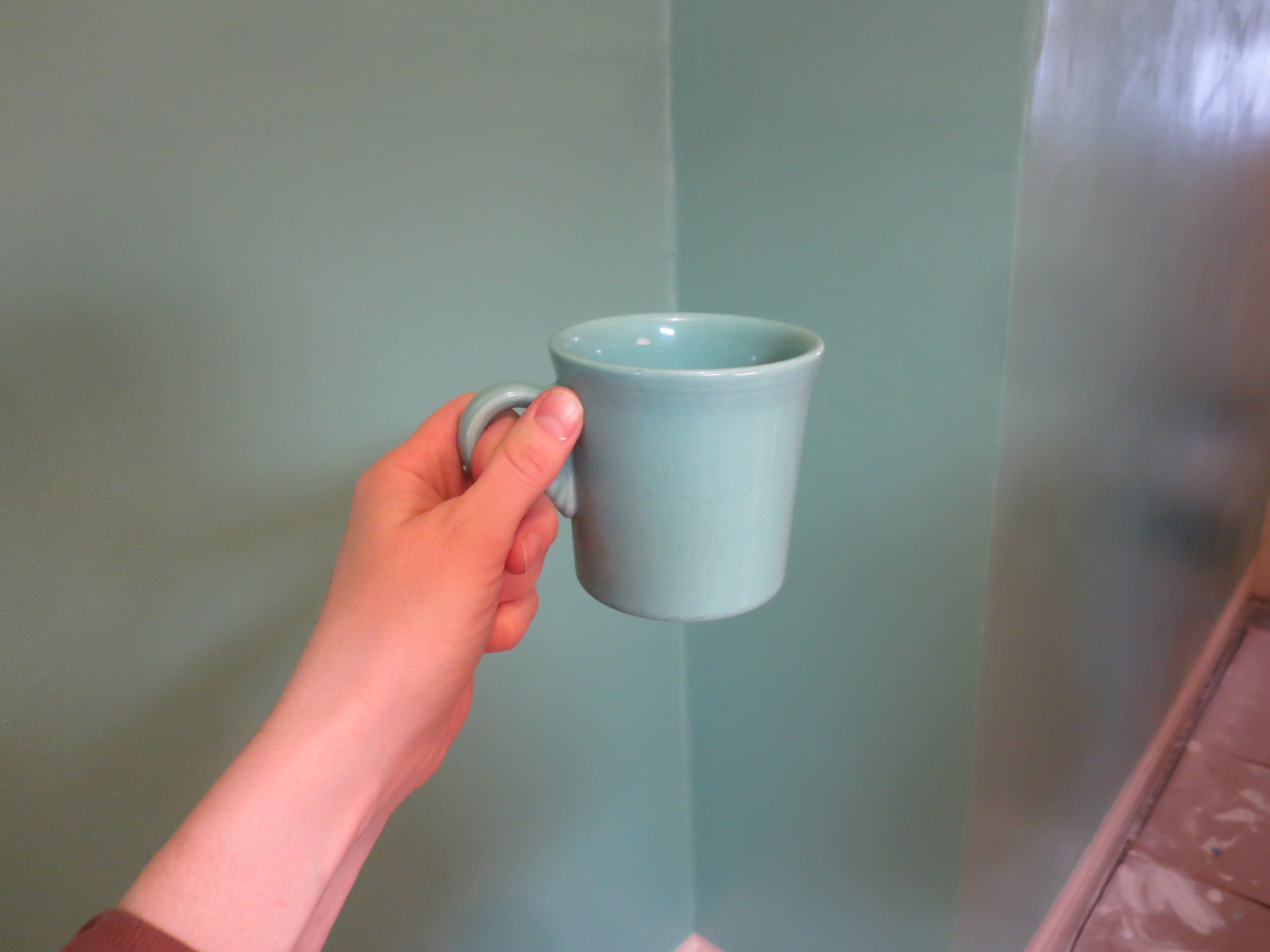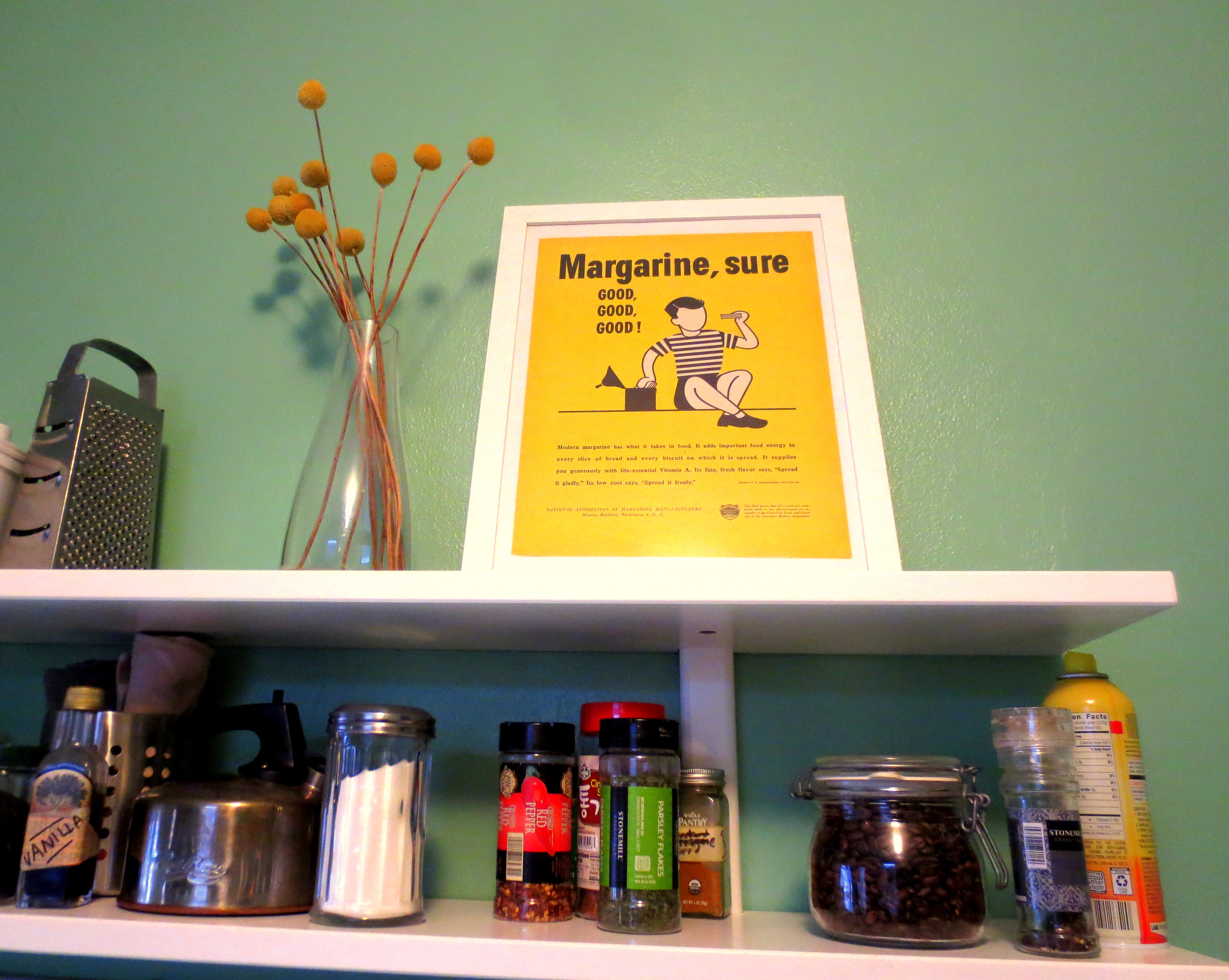 Here’s a closeup of the kitchen wall after what appears to be 50 years of drinking, smoking, hitchhiking, and bar fights* (before and after a TSP scrub): TSP_beforeandafterAfter the big scrub-down, we gave everything a nice coat of white primer.  The next day, we painted the ceiling a crisp white, and the walls the color of my favorite Mid-Century Fiestaware® coffee mug: IMG_5652 IMG_5672When the paint was barely dry, I hung these three IKEA Grundtal wall shelves in the formerly useless corner between the windows (Babushka put her fridge there, blocking the back window). These shelves ain’t pretty, but stainless steel fits effortlessly into any kitchen. More importantly, they’re cheap, lightweight, easy to install, and hold nearly 40 pounds of stuff: IMG_5668Next we hung this lovely white IKEA Varde shelf. In contrast to its Grundtal cousins, the Varde is heavy, awkward and useless, weighing more than it can hold.  But it sure is pretty above our gleaming white 1957 stove: IMG_5673Finally, we mounted a couple of LED light strips under the original cabinets to brighten the sink area. And I dare say that now, we’ve got a mostly functioning kitchen.  Let’s take a tour! Here’s that shelf above the stove, now charmingly cluttered: IMG_5790Until we can figure out something better, we just wedged an old IKEA Micke desk between the stove and the fridge.  The stool we found in the alley behind our last apartment. IMG_5804Note that I was in the middle of making dinner when I snapped these pics, hence all the food preparation that seems to be going on.  The light just seemed right.  IMG_5810If we swing around to the other wall, you’ll see that my beloved Upcycled Recycling Center has finally found a home in the Babuska kitchen! Traveling along the west wall, you’ll see that there’s enough free space for a “breakfast nook” — our patio table, plus the two pink chairs that Babushka left behind. Note that since the coffee cups match the wall, they virtually disappear in your hand. For whatever that’s worth: IMG_5792And the old Kelvinator Kabients couldn’t be more thrilled to be surrounded by green, picking up the undertones of their glass doors. And that under-cabinet lighting makes dishwashing almost tolerable! IMG_5806IMG_5798(artwork courtesy of Matt Avery/ PSA) IMG_5803We’re pretty happy with our little makeover, which (not counting the floors), cost about $200 total.  The paint color- while period-appropriate– pushed me out of my comfort zone, and I couldn’t be more thrilled.