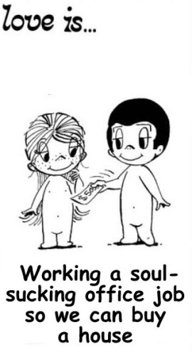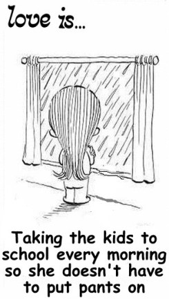 Sometimes my mother-in-law will clip a comic called “Love Is…” out of the paper and mail it to us. “Love Is…” follows the trials and tribulations of two naked 6-year-olds in love. Occasionally one of them dies, or goes off to war, but their love remains strong.