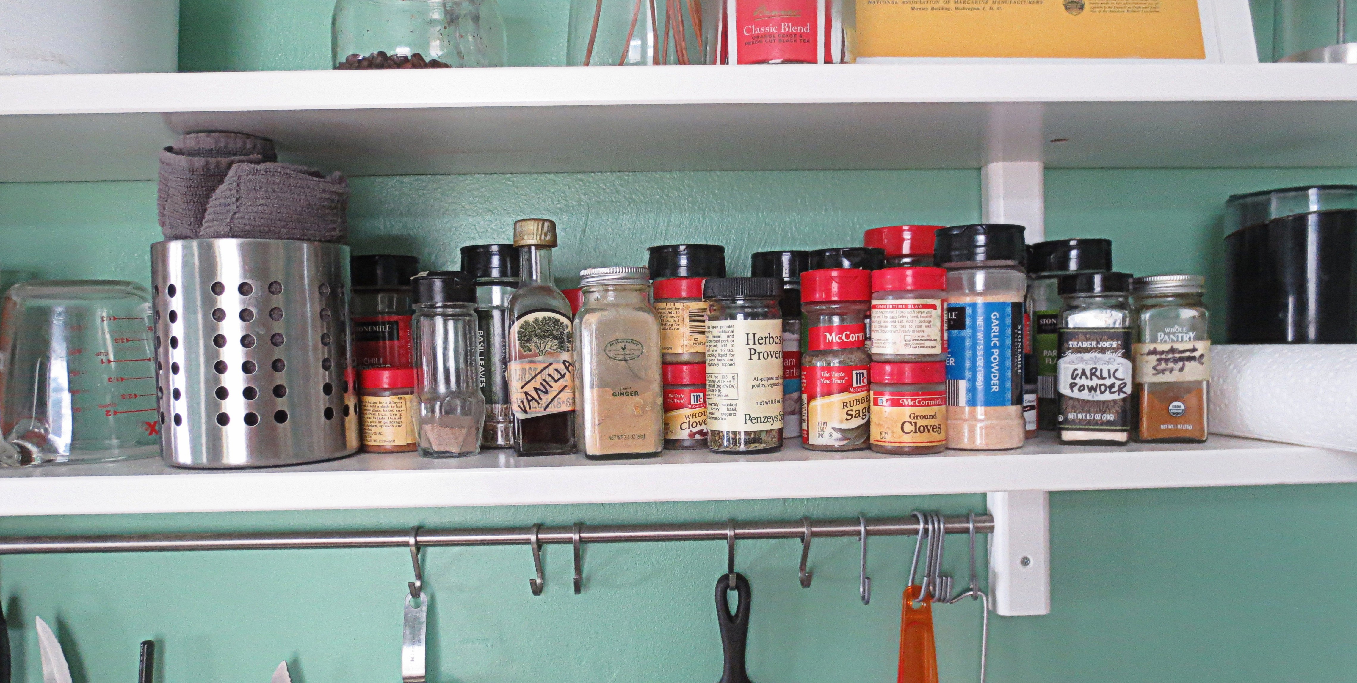 Generally, I adore the airy, exhibitionist look of open shelves. But the visual cacophony* of labels and gharish packaging gives my Inner Minimalist a migraine. See how these aggressively incongruous spices mock me!