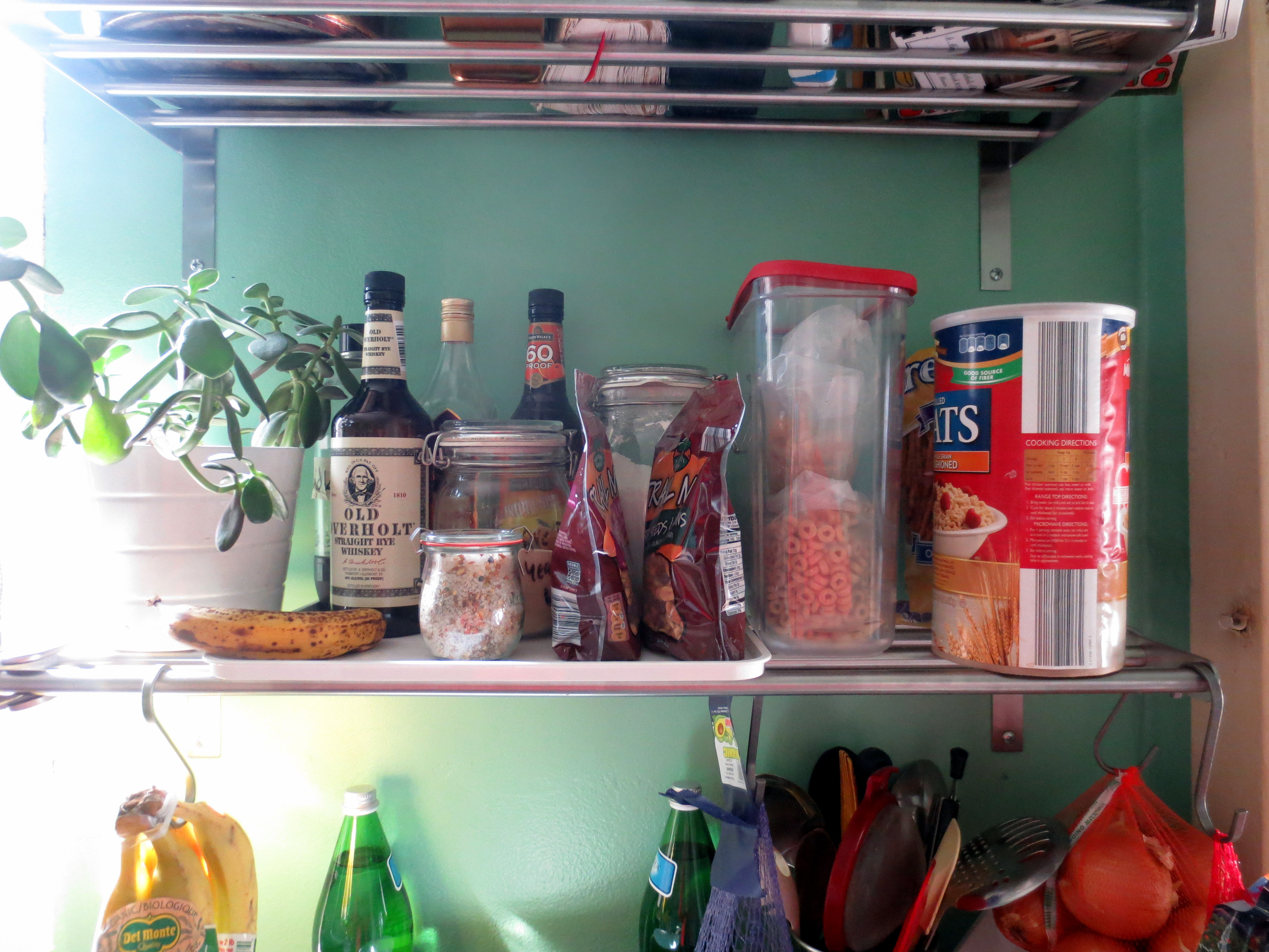 Oh wait, don’t pay attention to this shelf on the back wall; it’s a discreet hang out for breakfast cereal and hard liquor — the bookends of any good day. Let’s instead focus on the shelf above the stove, where we’ve been storing spices and dry goods: