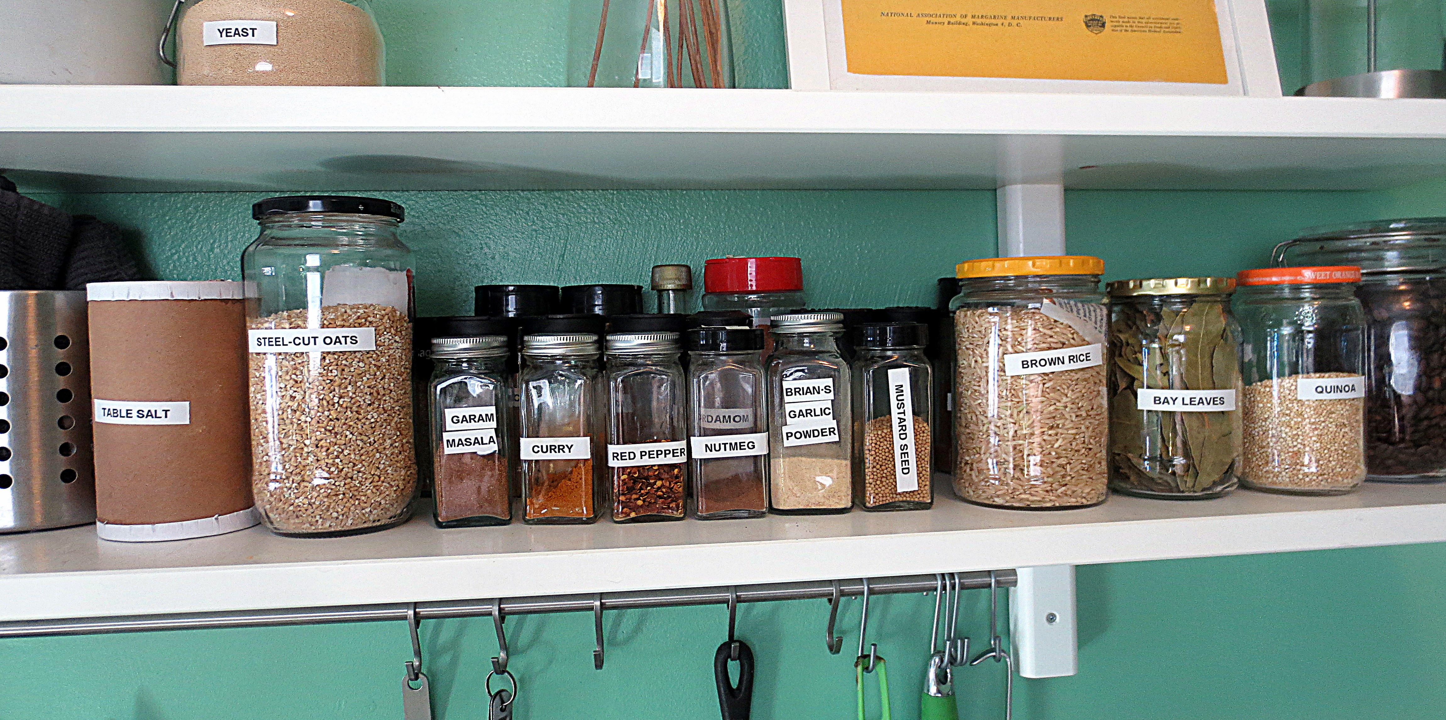 To achieve this look, simply start hoarding all your used glass jars — jelly, pickles, olives, spaghetti sauce. After a good scrub, dump your dry goods into the jars and slap on the appropriate label.