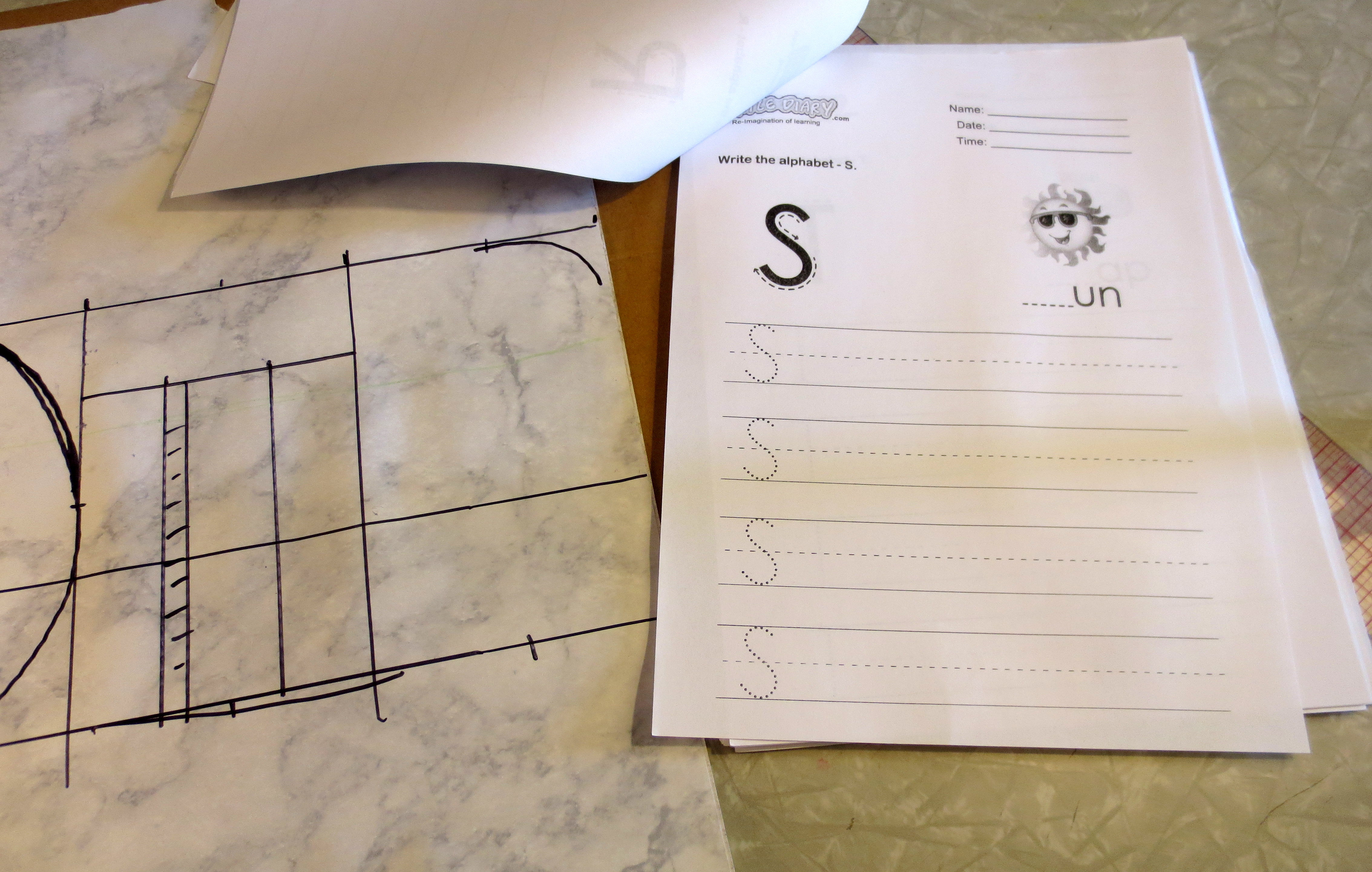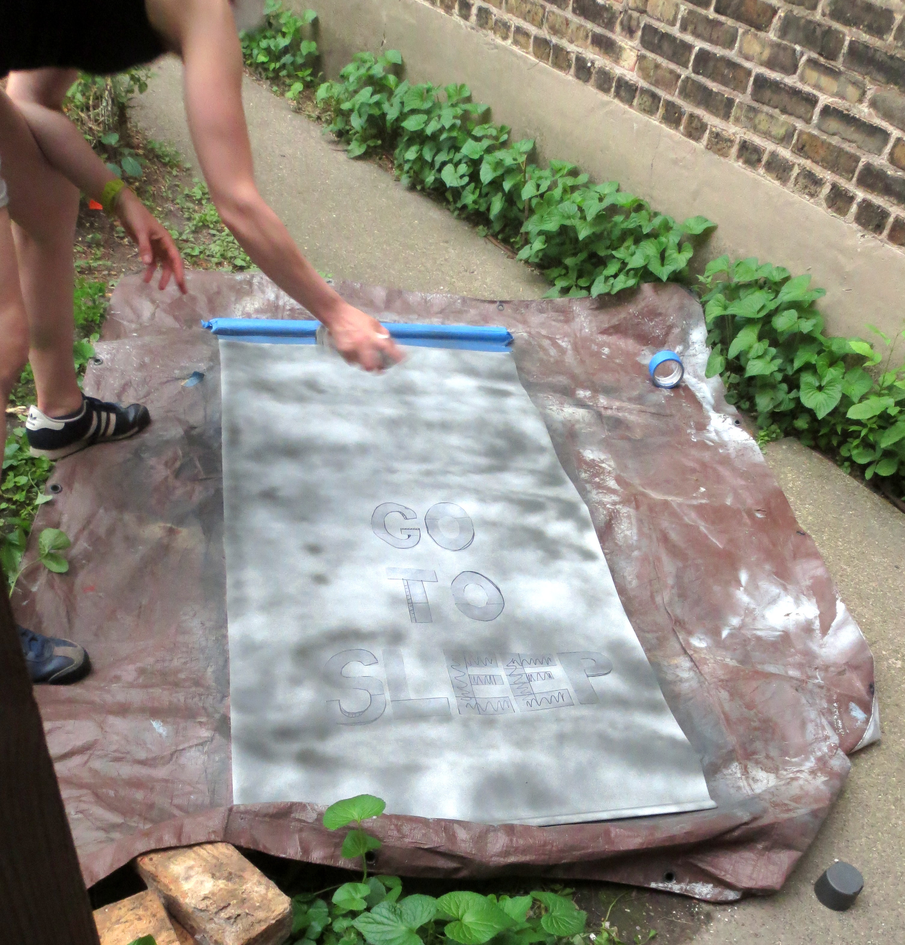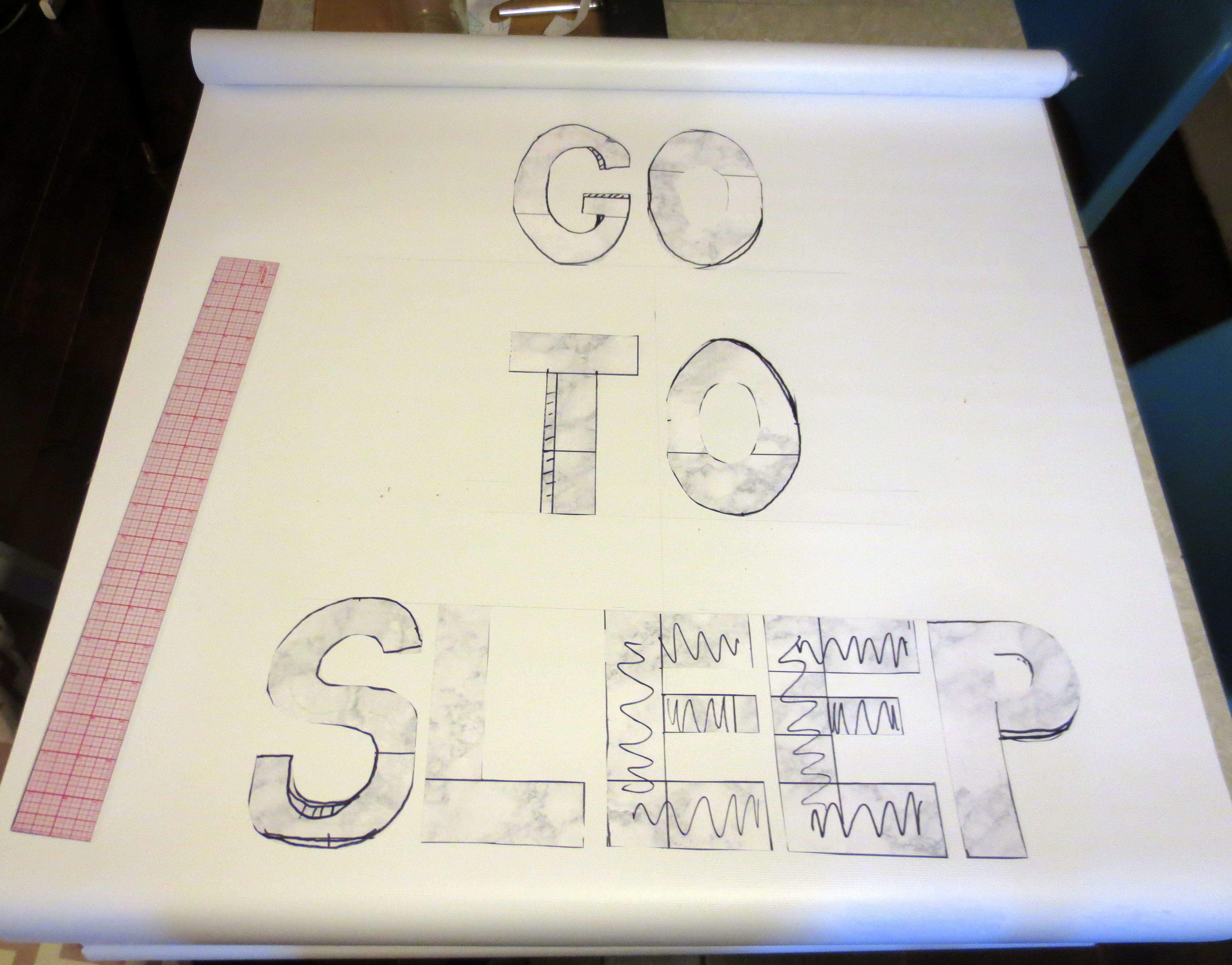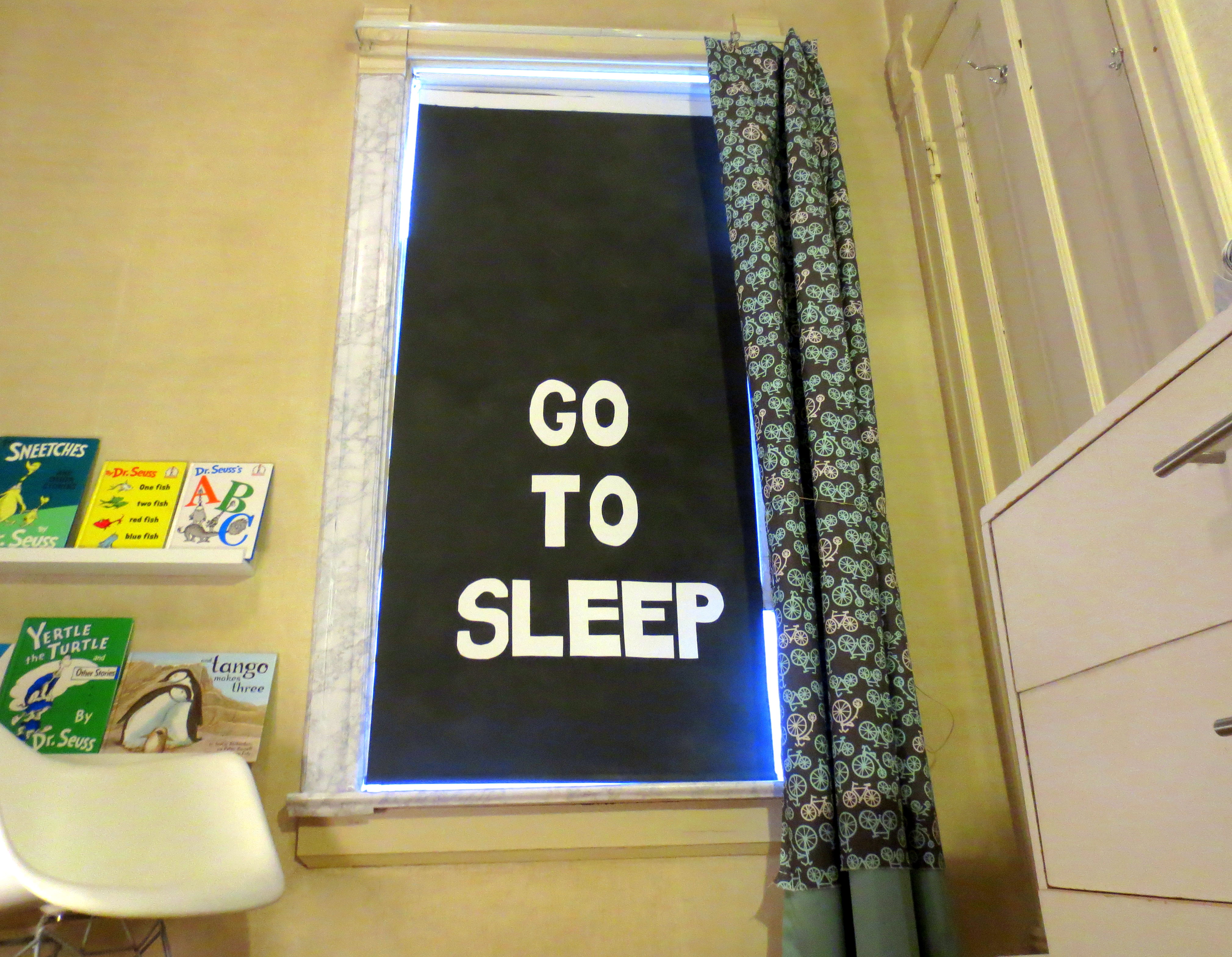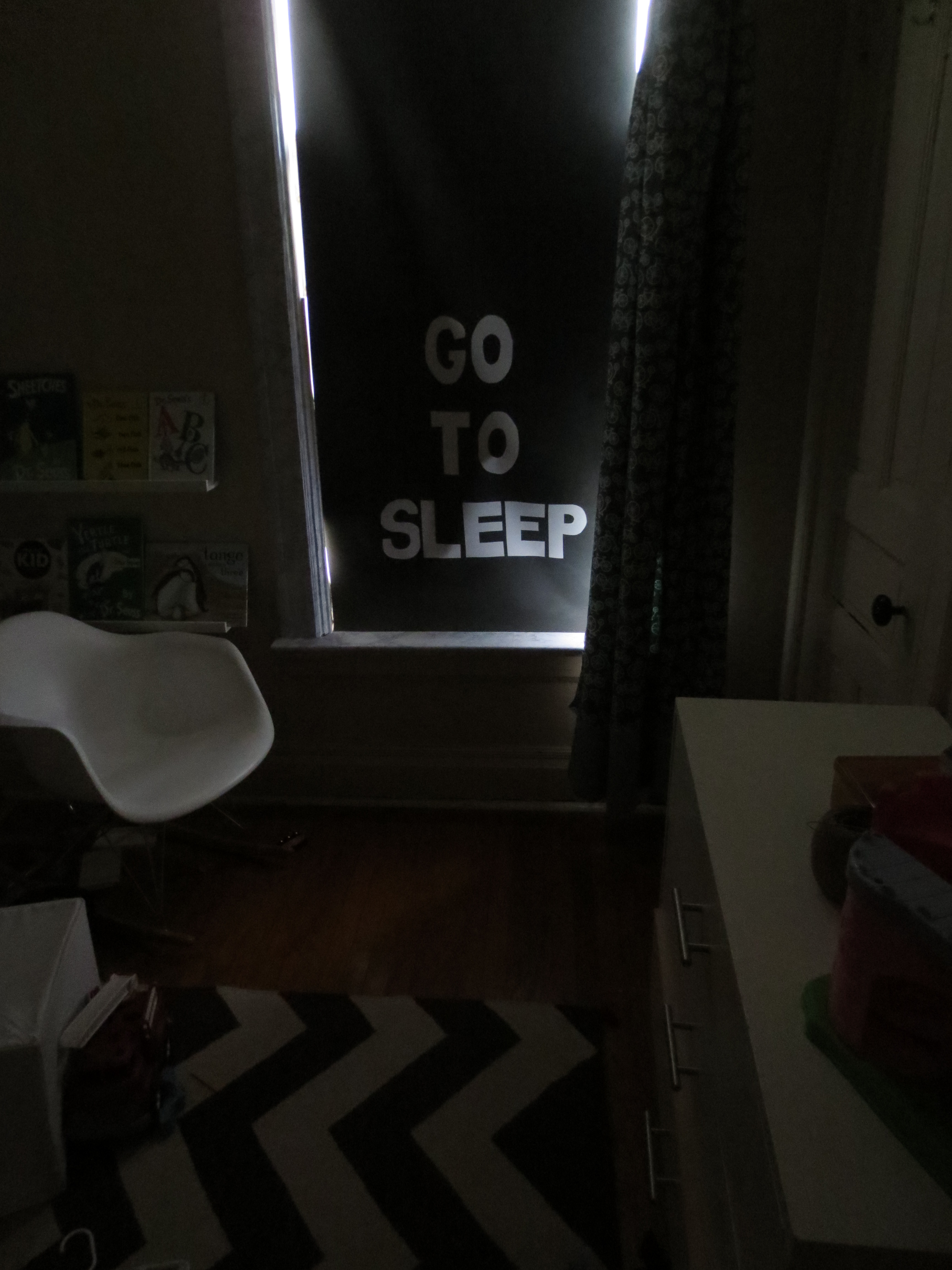 Think hard about what you want to say in your shades. Be concise and direct. If there is an “S” in your message, you may want to rethink your message, cause S’s* are impossible to draw. The best I could come up with was “GO TO SLEEP.” I briefly considered “REMAIN UNCONSCIOUS” but that phrase has 2 S’s, and if one of the kids ever fell into a coma I would feel really bad about having those shades up. If you must use the letter S, grab your preschooler’s writing homework for guidance.
