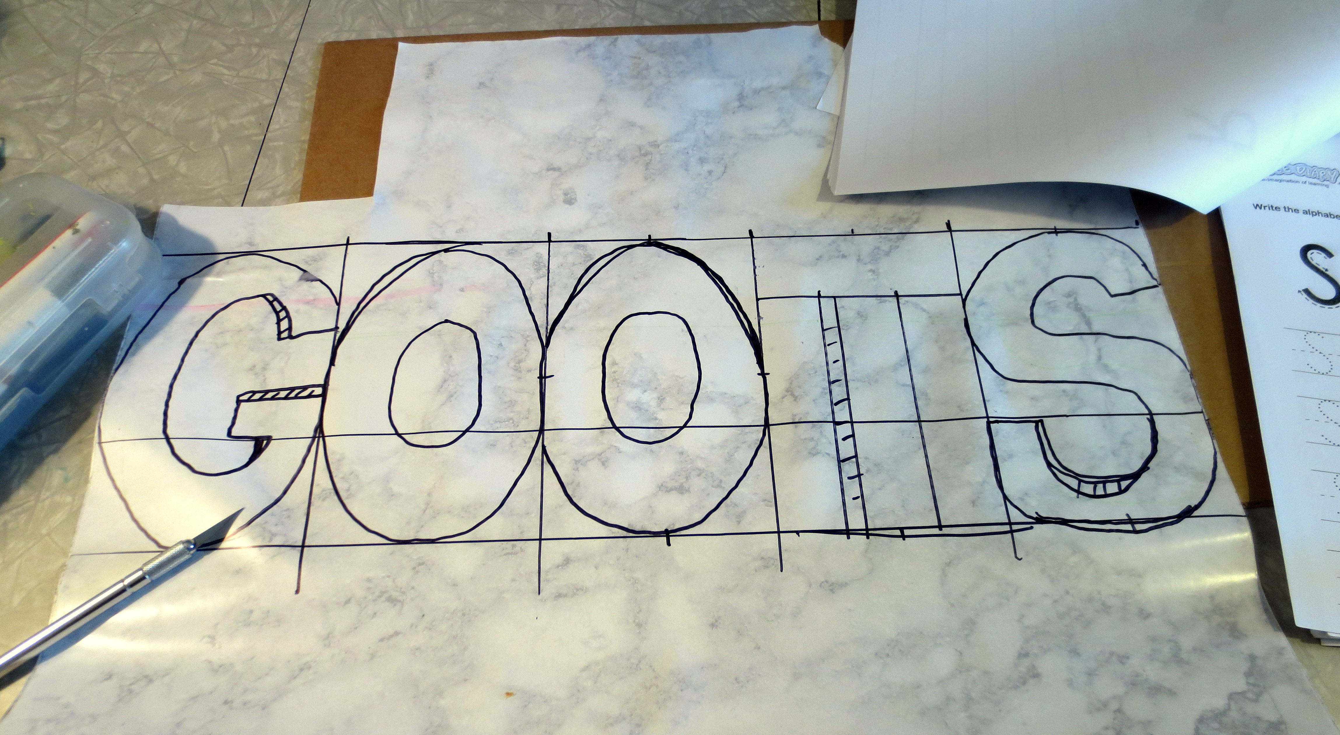 STEP TWO – LETTERS: Lay the contact paper flat on a piece of cardboard or some other surface you don’t mind scratching (so, not on your vintage dining table or on your lap). Measure out some “boxes” so your letters are roughly the same size.