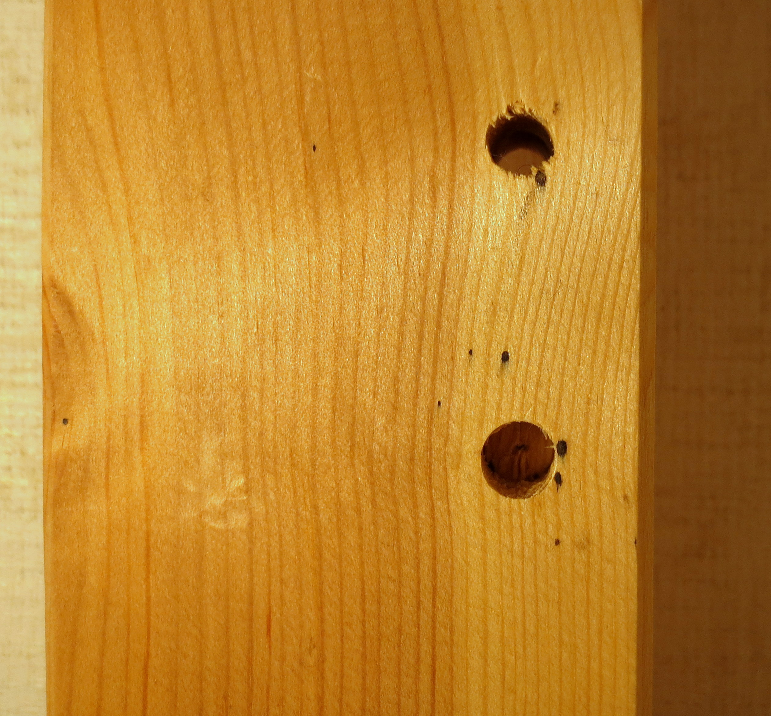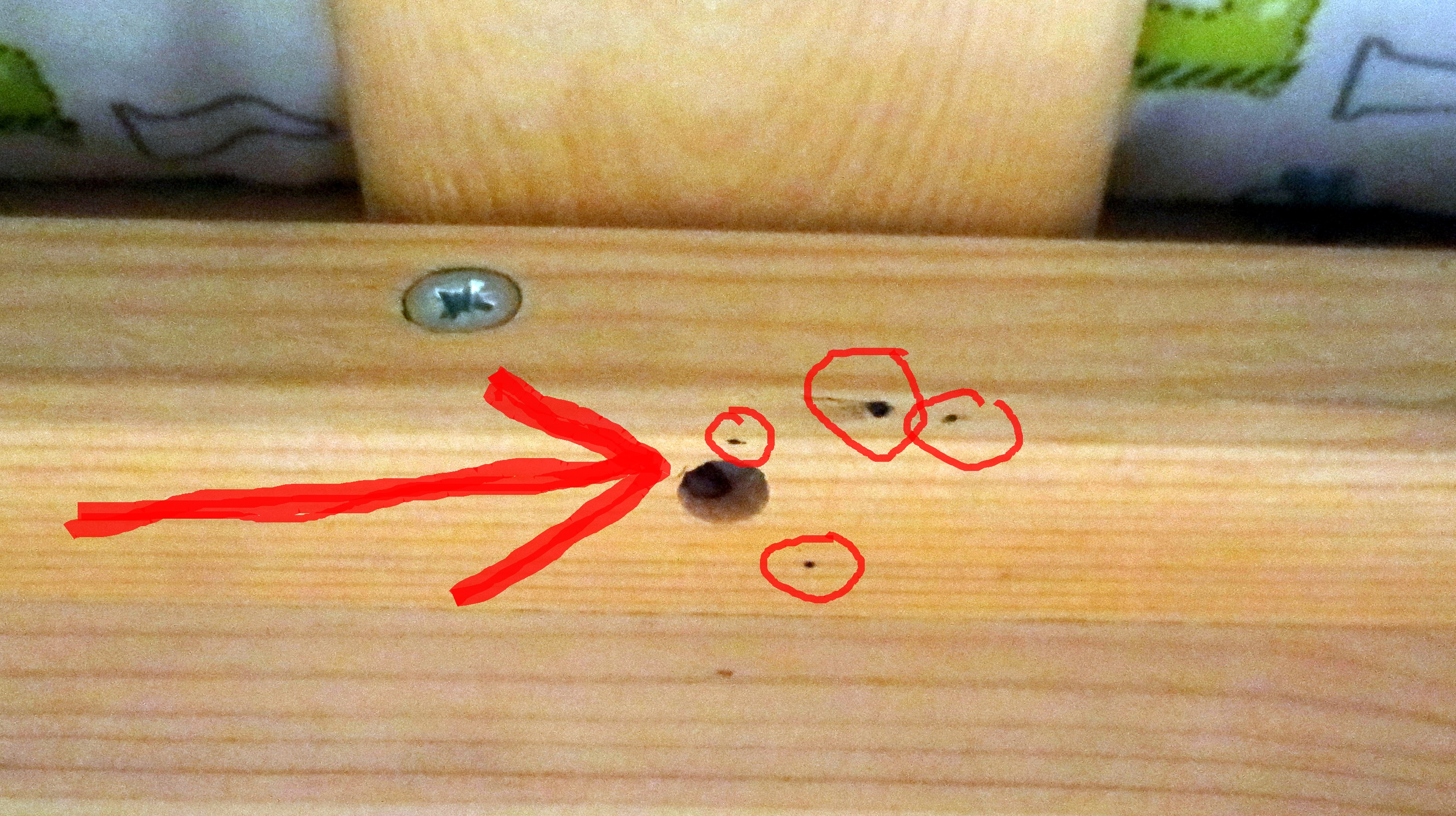 The first clue was the little black spots around the screw holes. Bed bugs will happily drop a load right outside their “front door:”