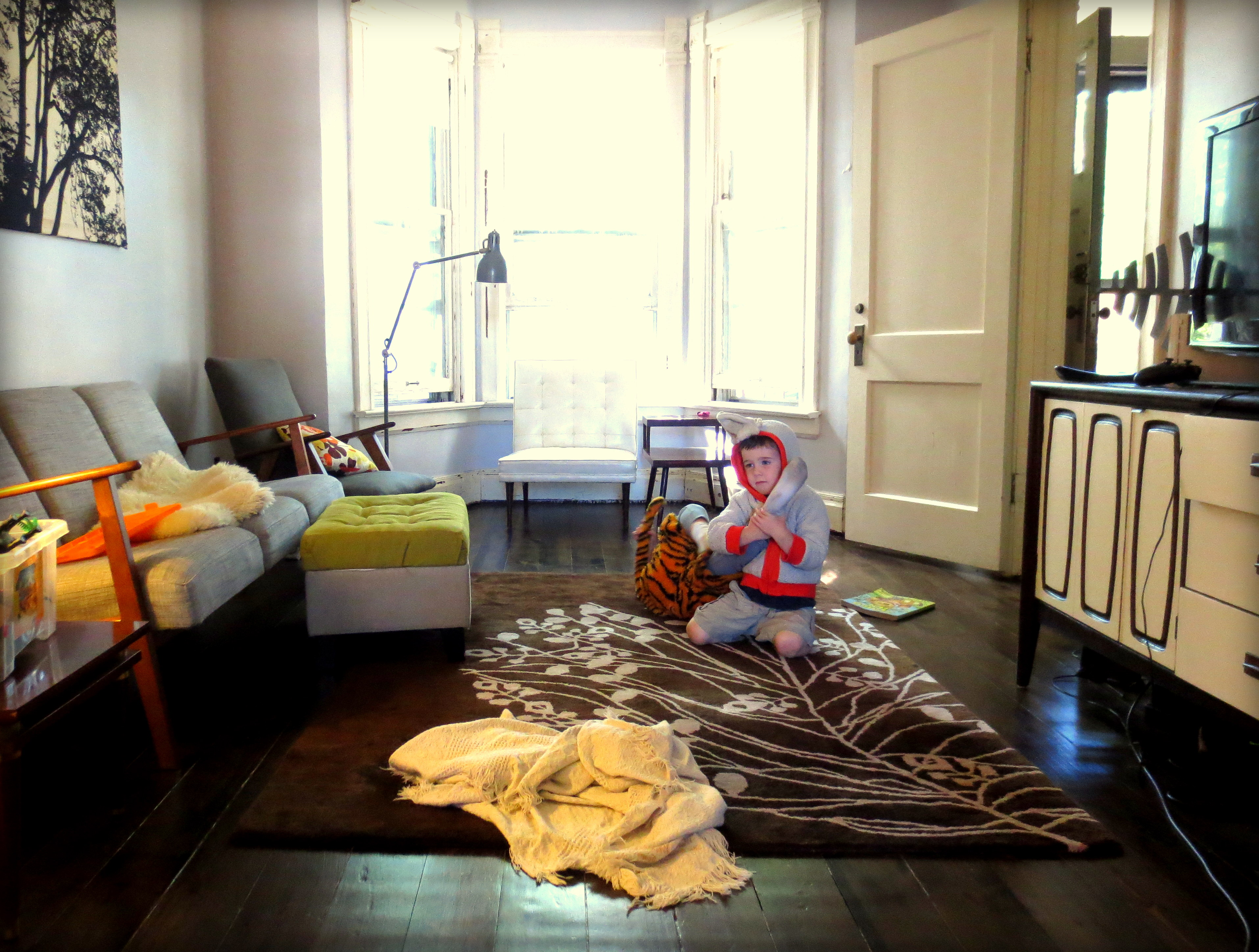 I craved a lighter floor sweater to break up the darkness; something big, wooly, warm and bright, but not distracting enough to overshadow the Marimekko print crowning the couch. I’d scan Craigslist, or the rug websites, but nothing grabbed me. I wasn’t sure exactly what I wanted. But like that man in the art museum, I’d know it when I saw it. Also, it had to be dirt cheap cause the rest of this house was bleeding us dry.