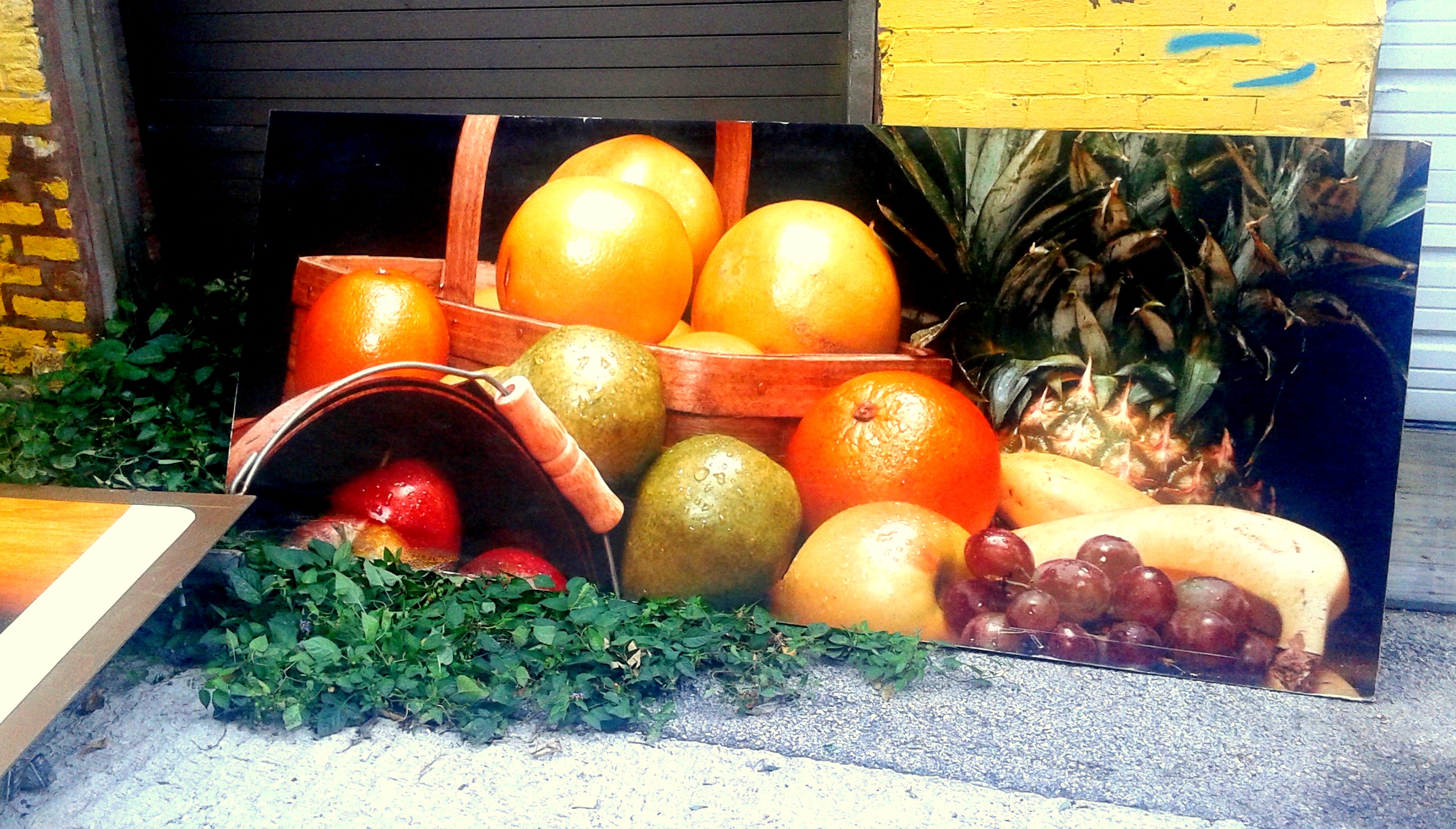 The Fruit Sign was stacked among several other giant Food Posters, including an even bigger one from the Egg and Dairy (and dish towel?) Department: