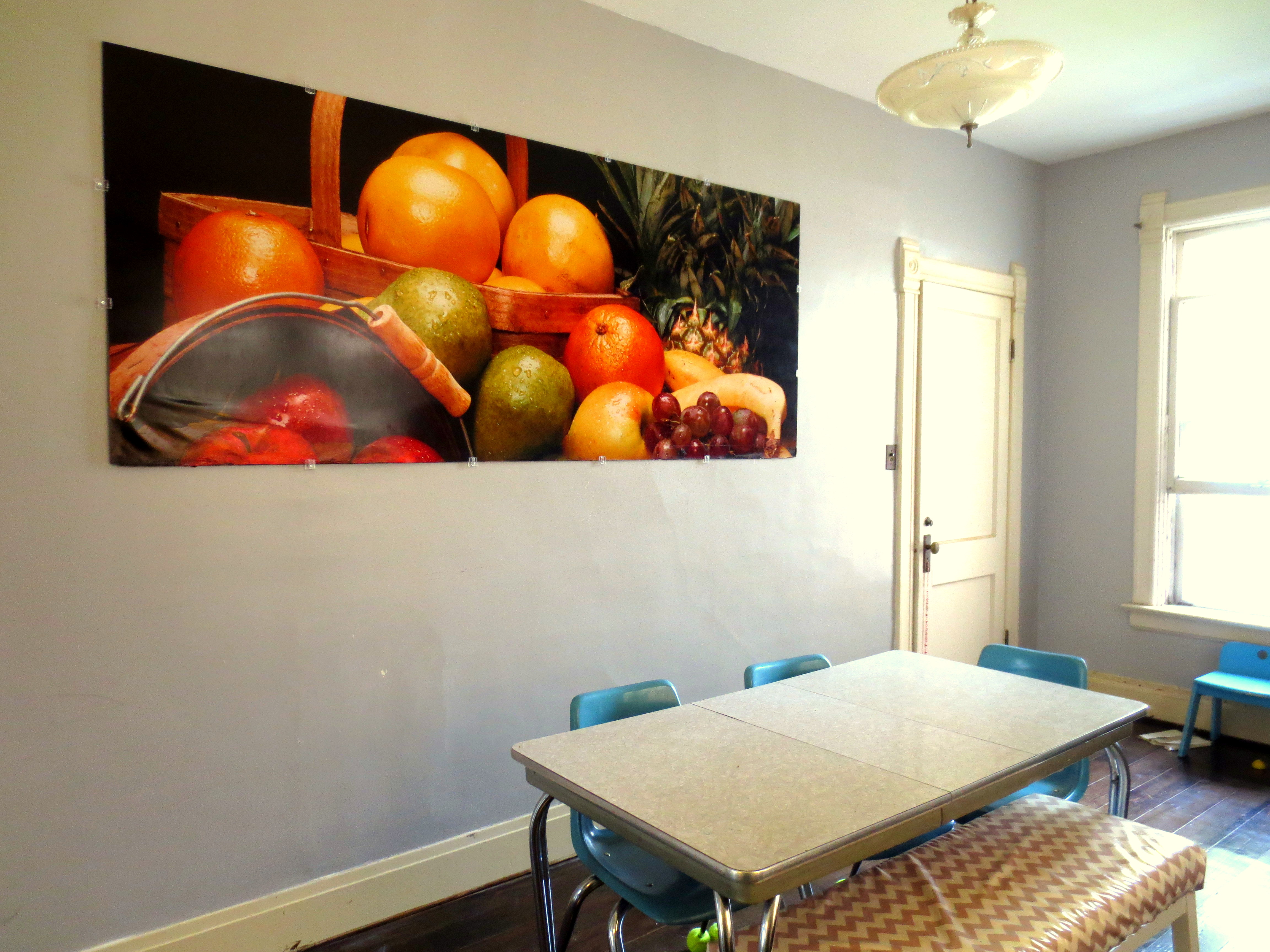 I’m hoping it will provide some subtle (OK, not-so-subtle) messaging to the family to eat their fruits and veggies. We’ve had one meal so far in the dining room, and that was my lunch with the 4-year-old. I documented a 200% increase in veggie consumption. Meaning, he ate all his carrots and then proceeded to eat my carrots, too. So it must be working!