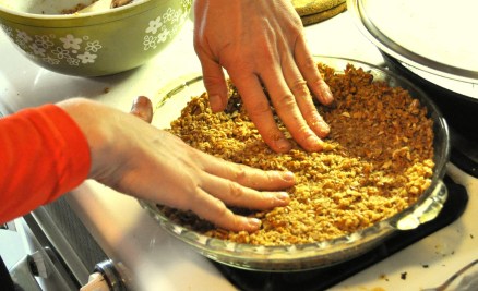 Firmly press the pretzel mixture onto the bottom, then up the side and onto rim of the pie plate.