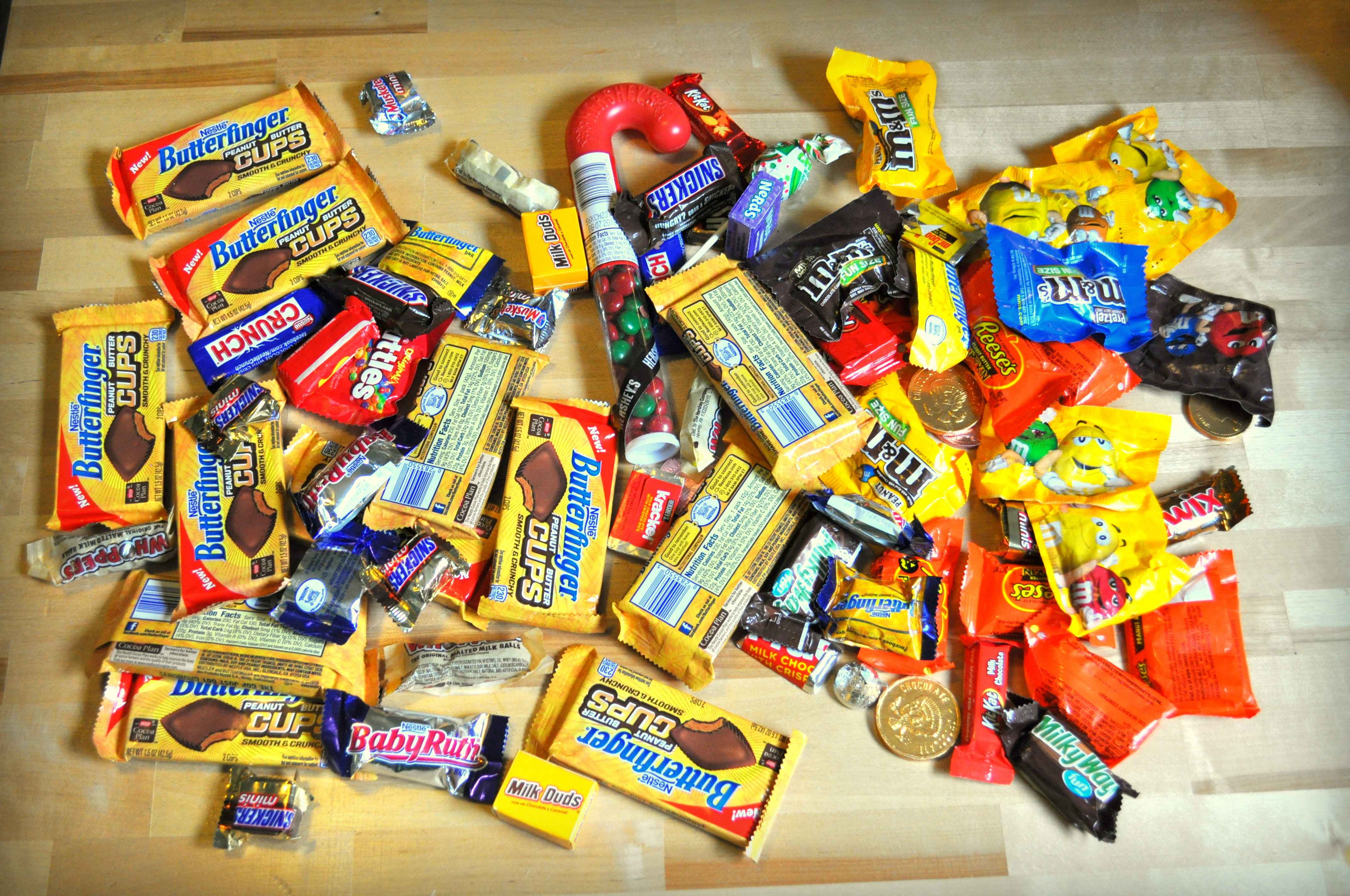 First, grab the bags of candy that have been left on your porch and dump them onto the counter for decontamination, removing anything not chocolate-based, such as Skittles™, Laffy Taffy®, Blo-Pops©, etc. Your stash should now look like this: