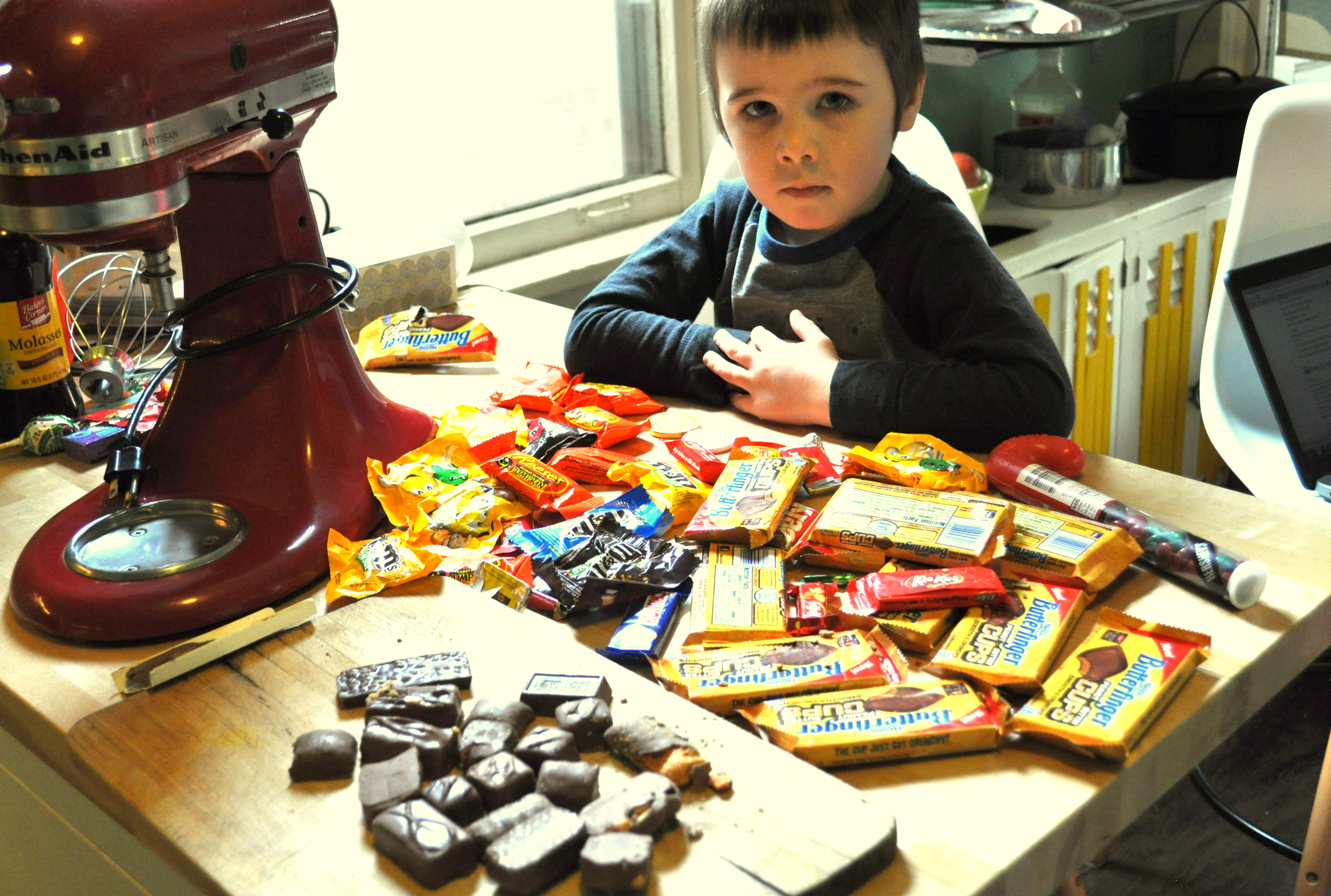 I’m gonna make a big confession here: All this candy was given to us by our three friends who left their bags on the doorstep. We’ll call them Megan, Mary and Rachel, because those are their real names. MY family does not leave any candy behind. Unless it fell underneath the fridge or something, then eventually we will locate it and eat that, too. But it makes the narrative of the blog post more interesting if I act like it was all ours.