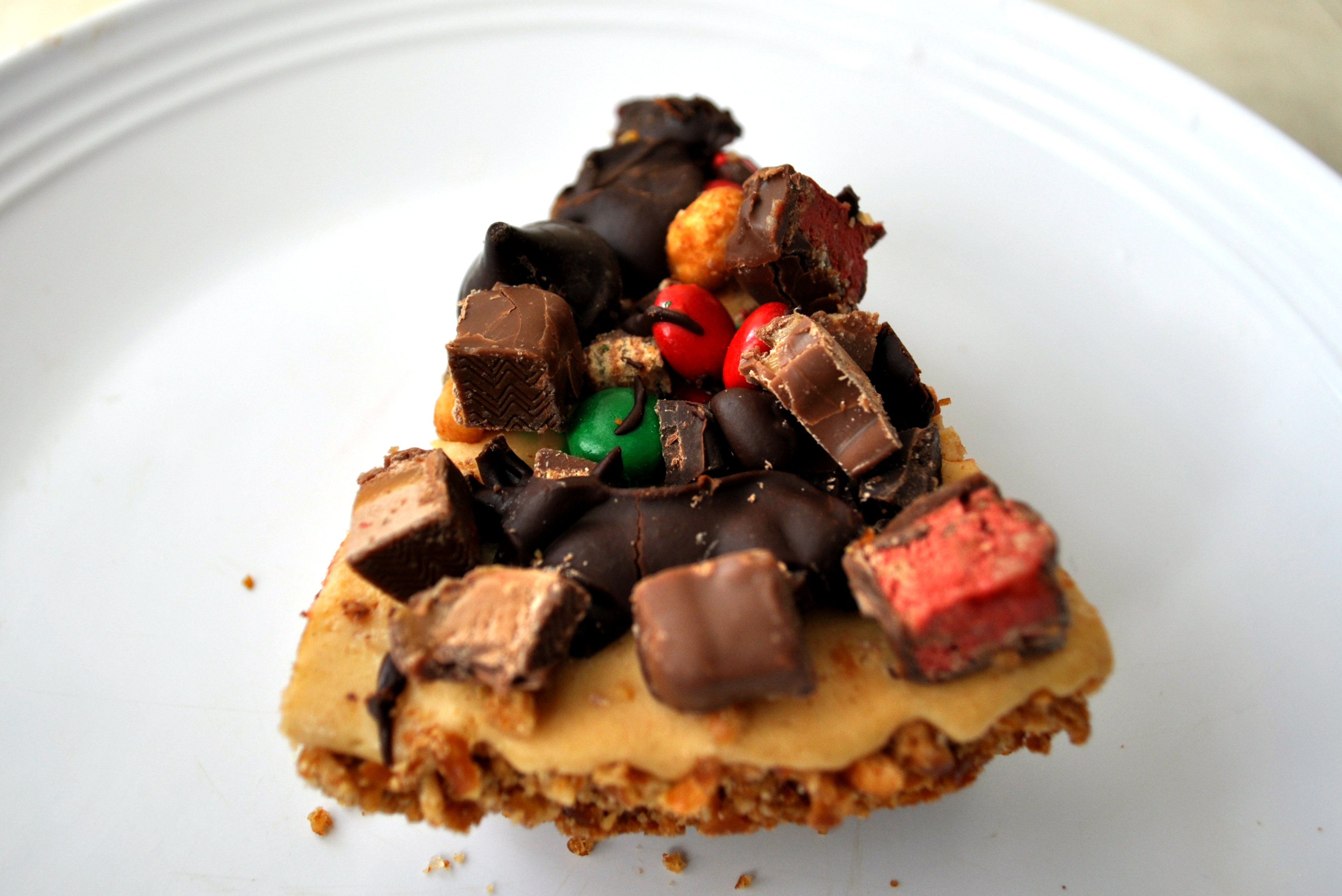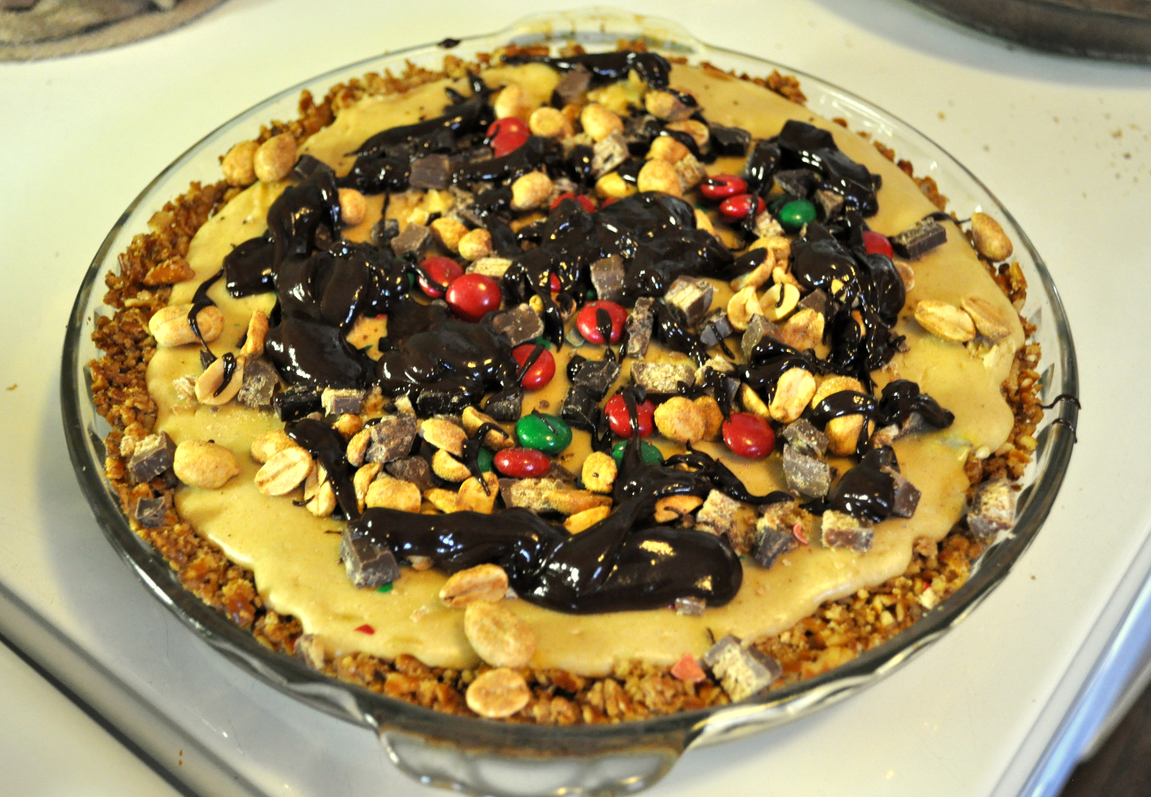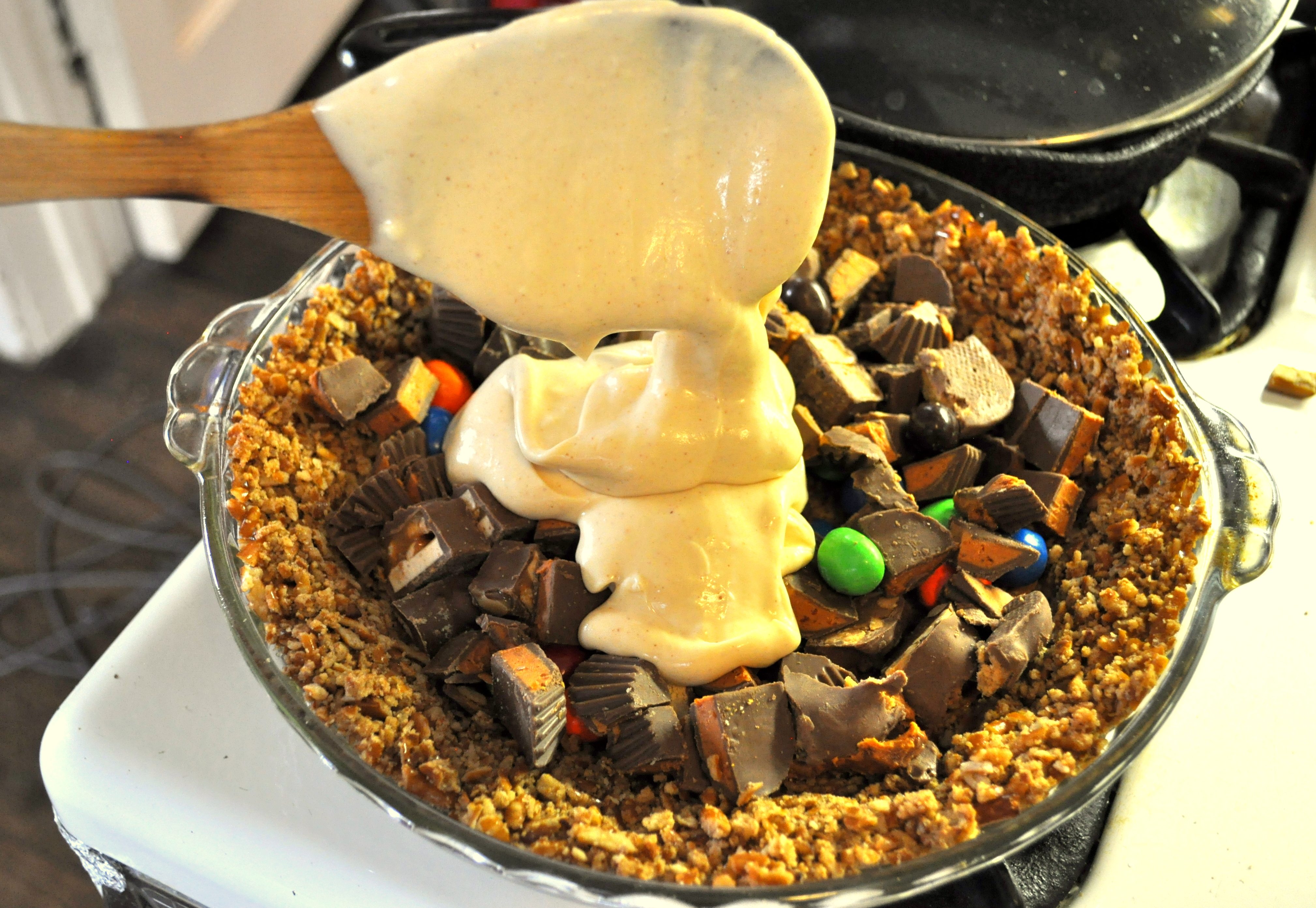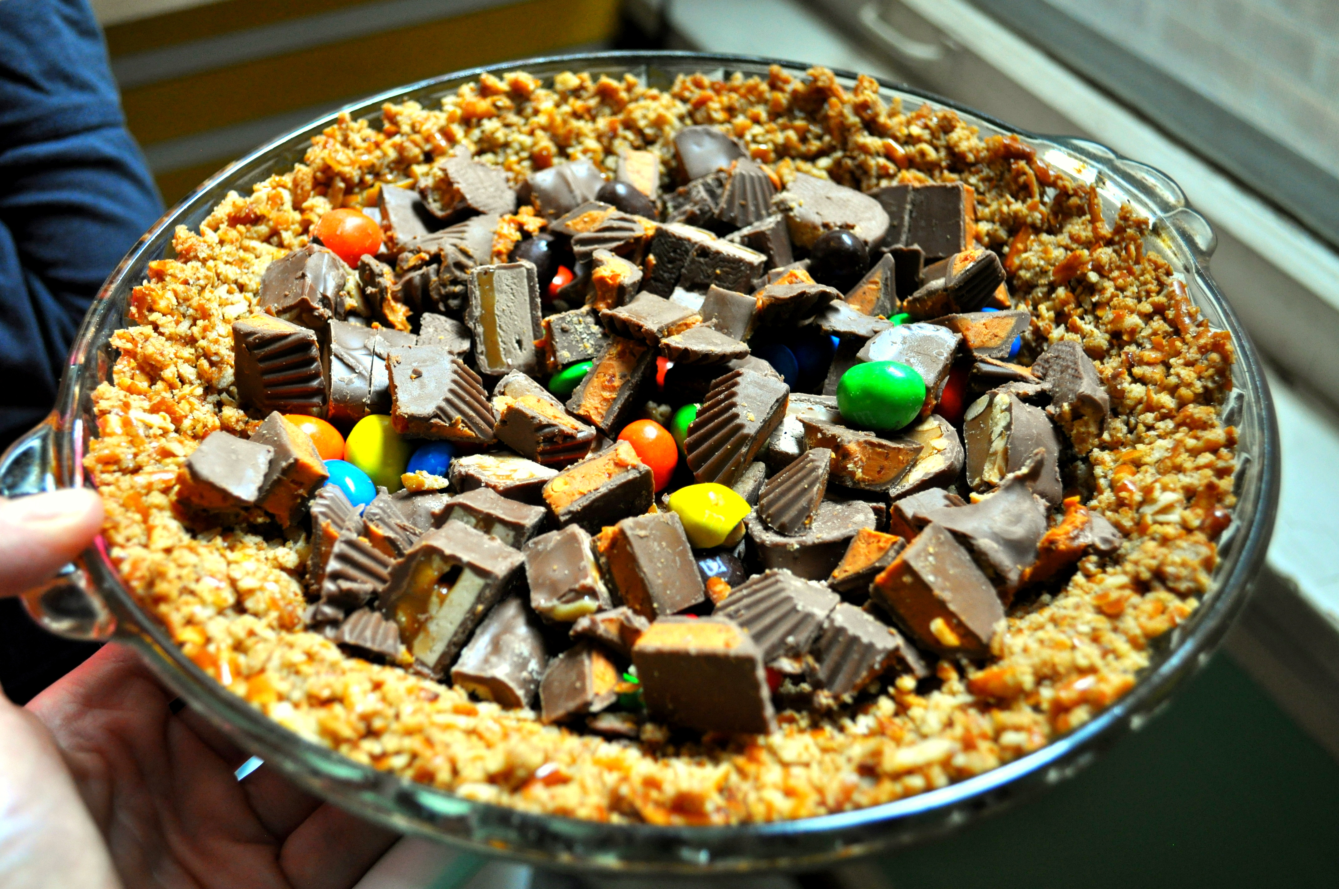 PROJECTOPHILE’S RECYCLED LEFTOVER HALLOWEEEN/CHRISTMAS CANDY PIE with PRETZEL CRUST