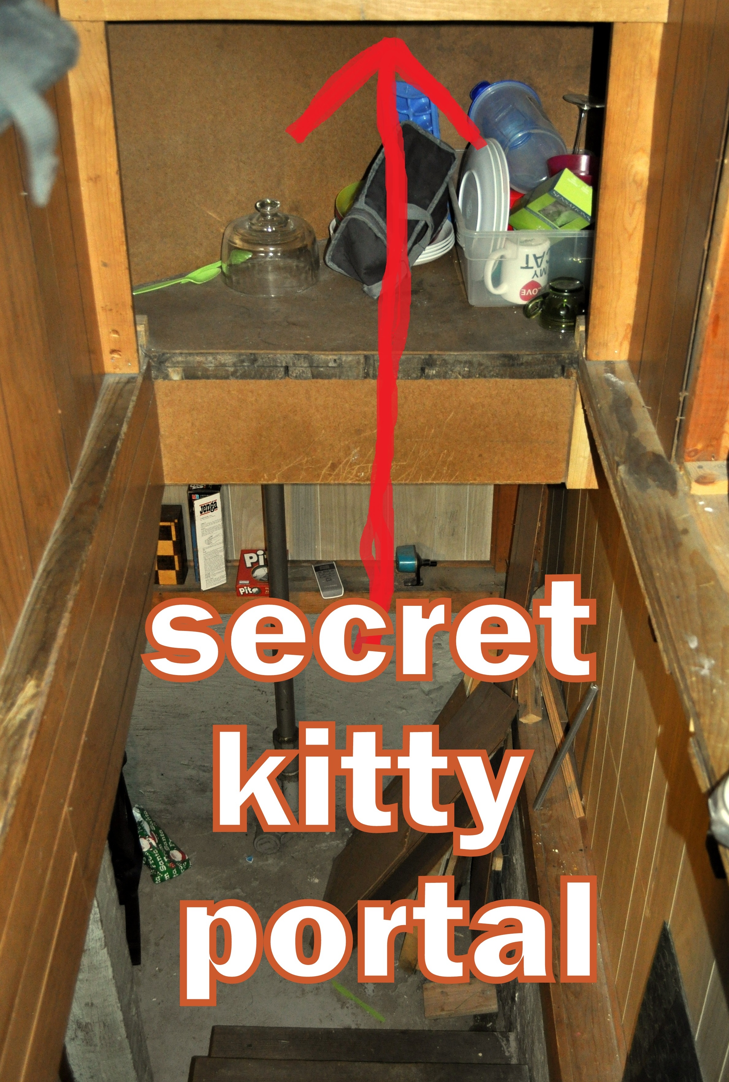 Scott tried catching Ceiling Cat with an old rabbit trap. Even though she triggered the trap door, Ceiling Cat managed to snatch the food and still slip back into her portal. For weeks, the empty trap lingered impotently in our front hall, reminding us of our cat-catching failure every time we stubbed our toes on the way to breakfast.