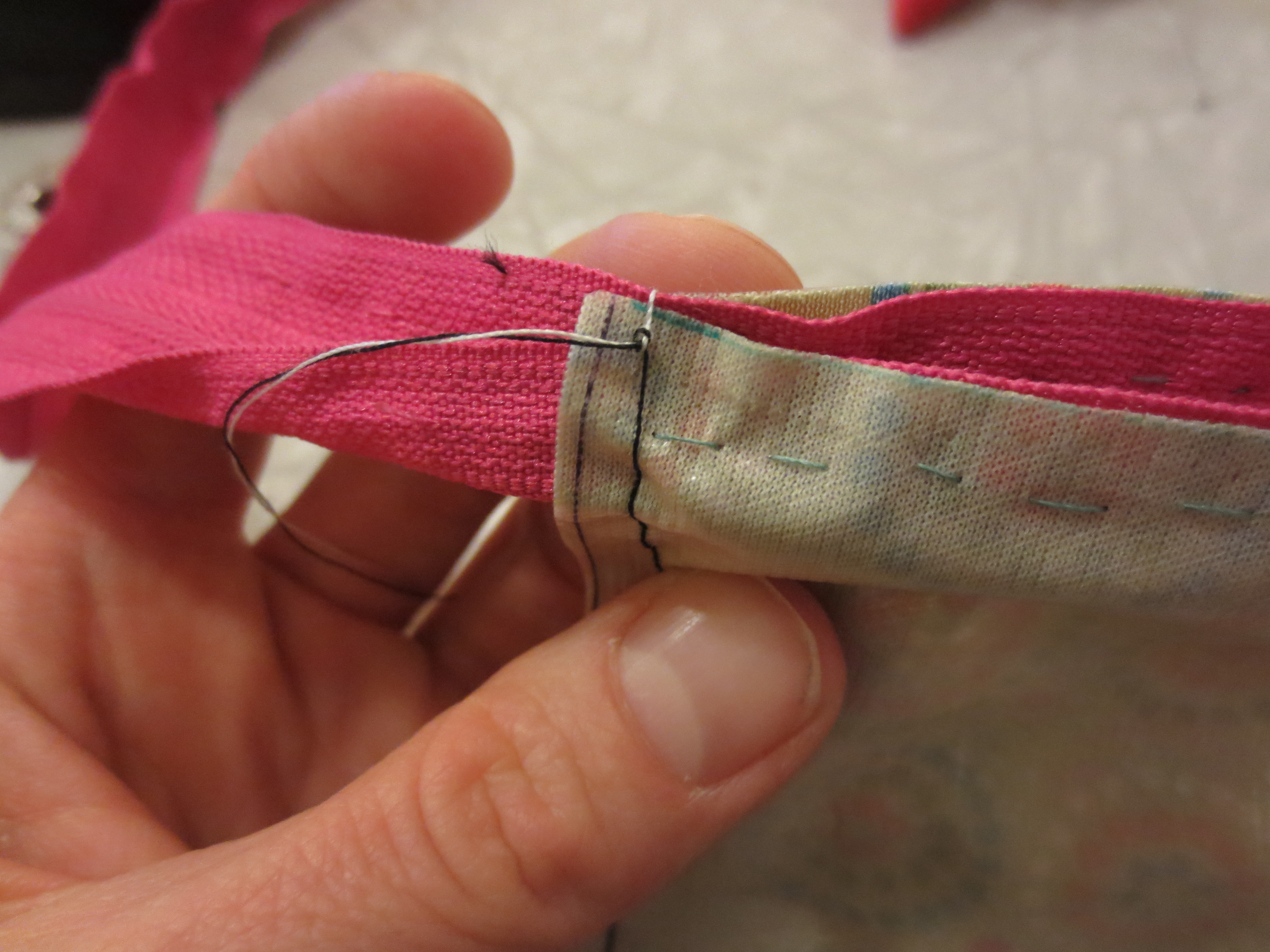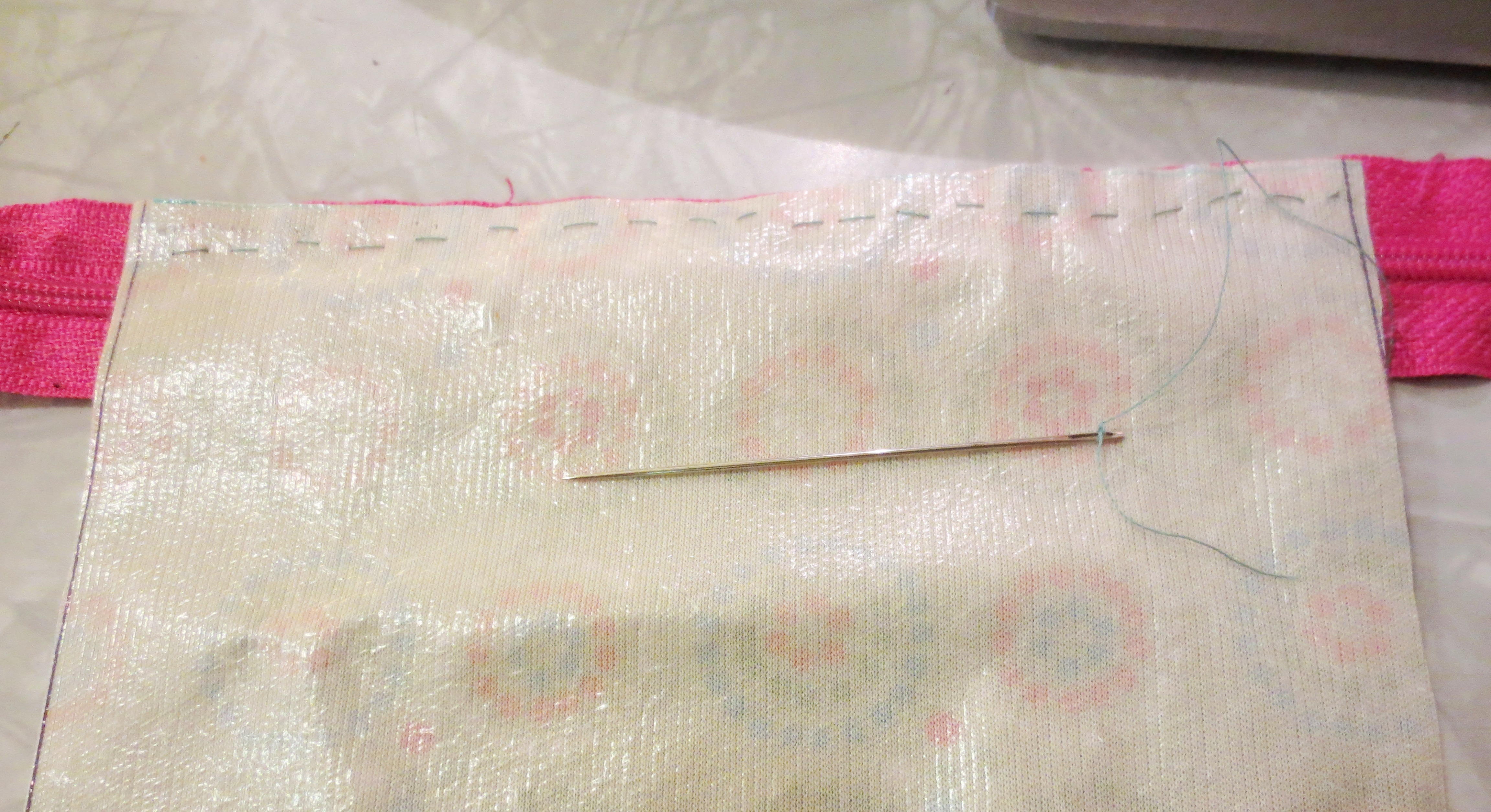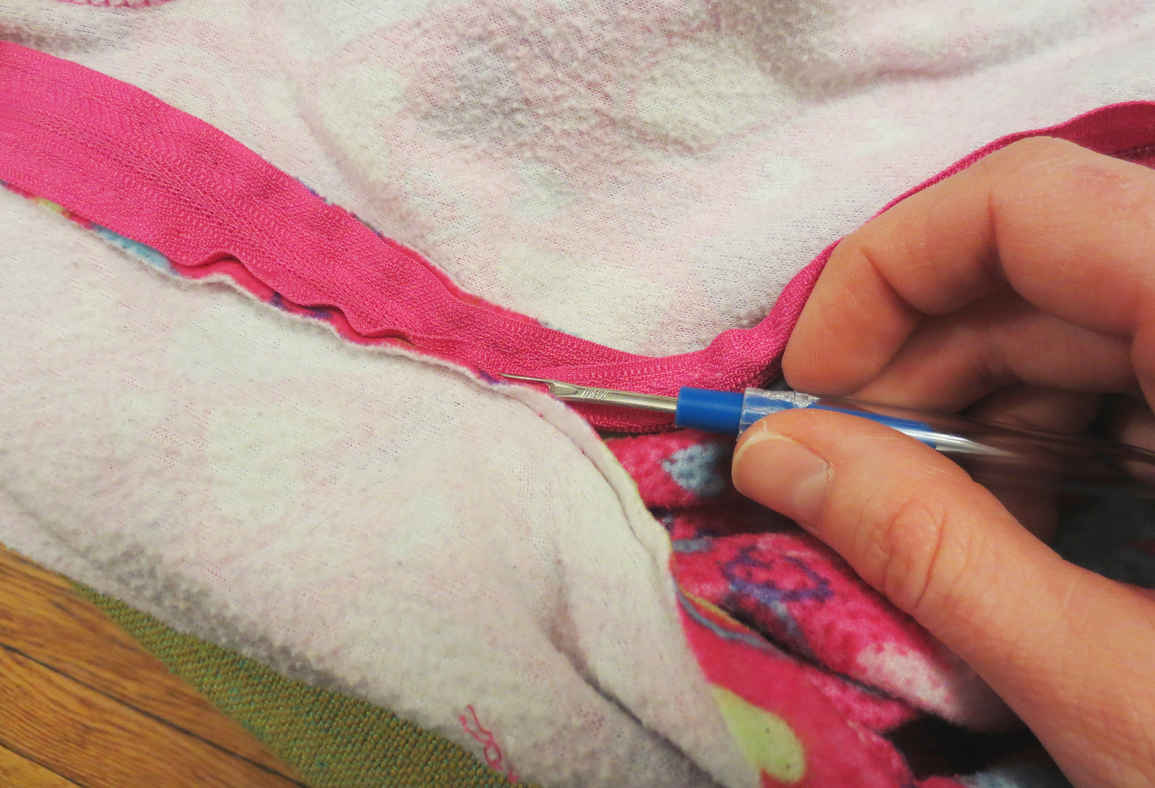 Full disclosure: This picture is a total fake-out. After Scott took the photo, I realized that I could not do this stitch without a zipper foot, which wasn’t included in my $20 Target sewing machine. Then Scott chimed in, helpfully, “Oh yeah, I had a bad case of zipper foot once, but I got it treated.”