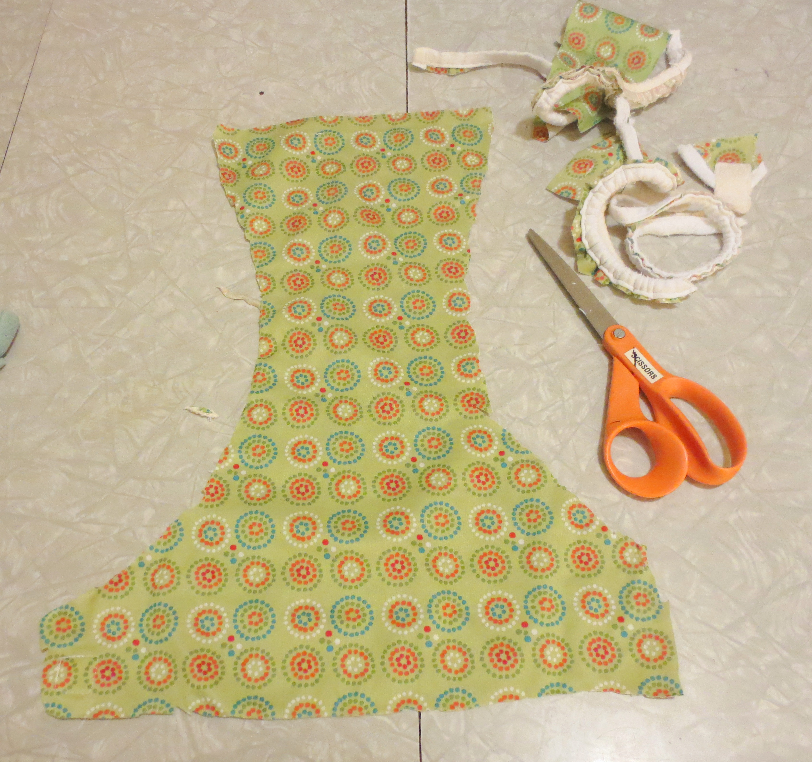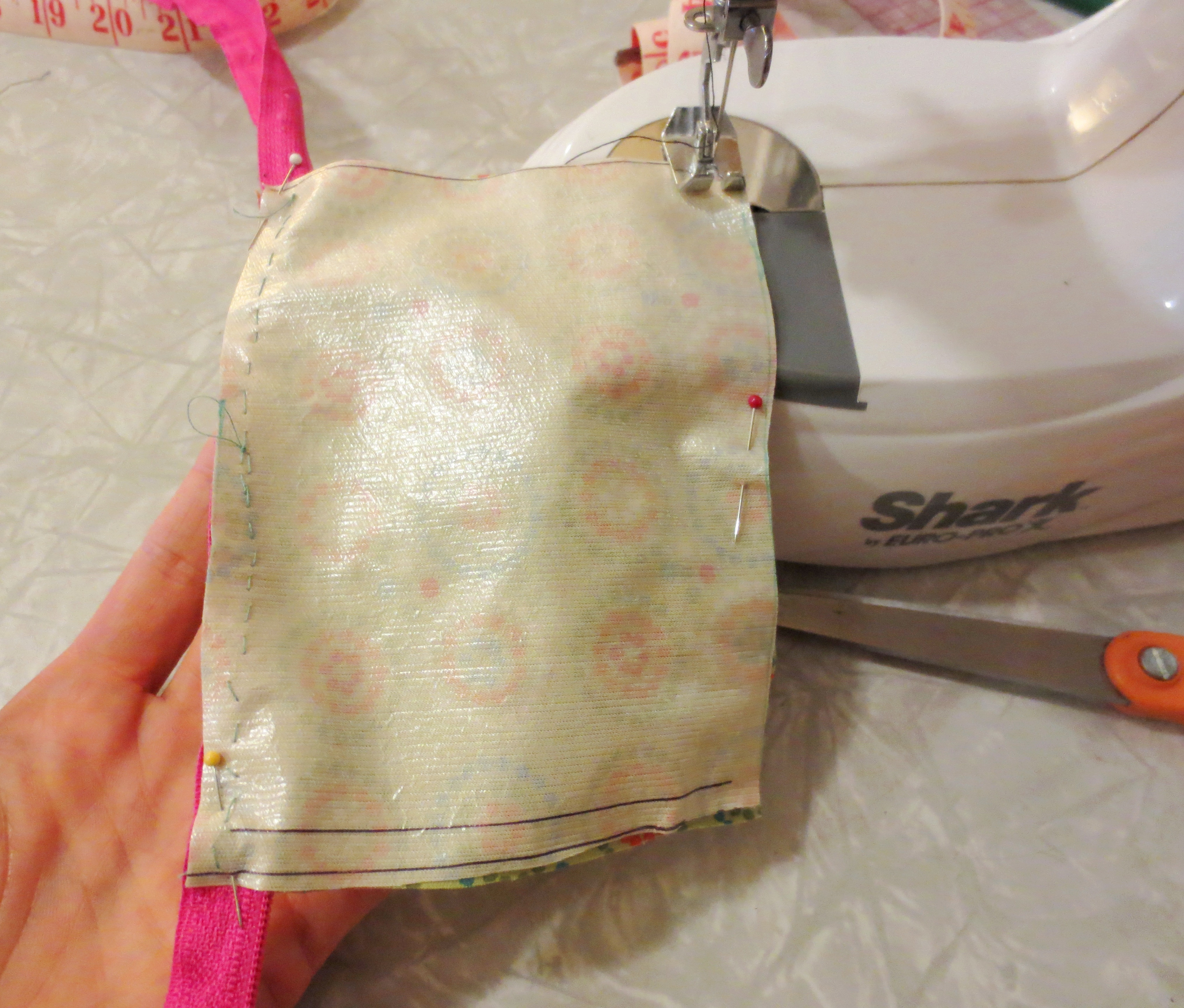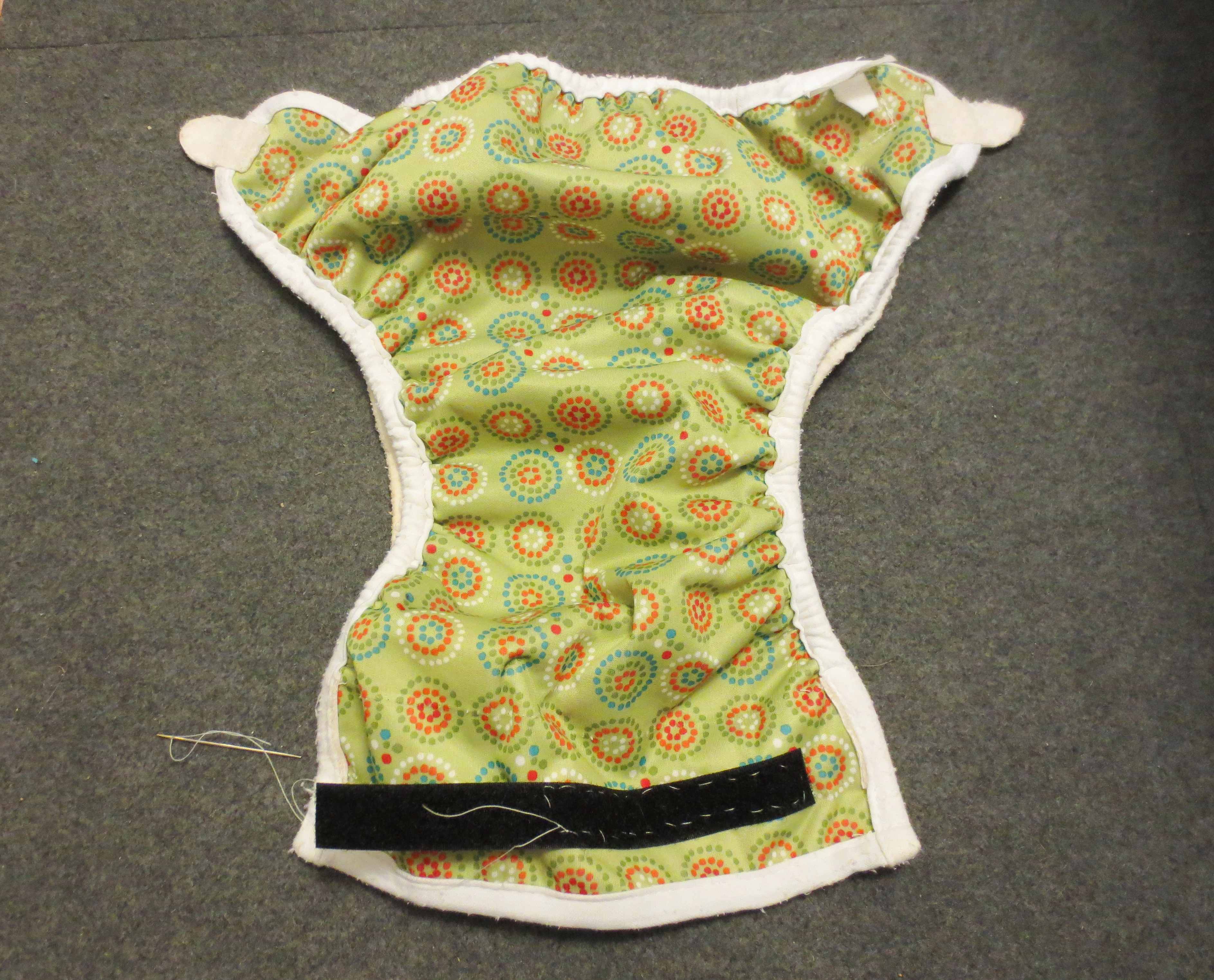 For the pouch, I wanted to stay with the theme of “old baby crap.” While rummaging around my sewing drawer, I found an old diaper cover that I had foolishly tried to revive with new Velcro™ (and, as you can see here, quickly gave up). Here’s how cloth diapers work: you wrap the baby’s butt in the equivalent of a lumpy cotton dishtowel, and then wrap the cloth-covered butt with a sturdy, waterproof cover, usually in a fun pattern, like this one:**