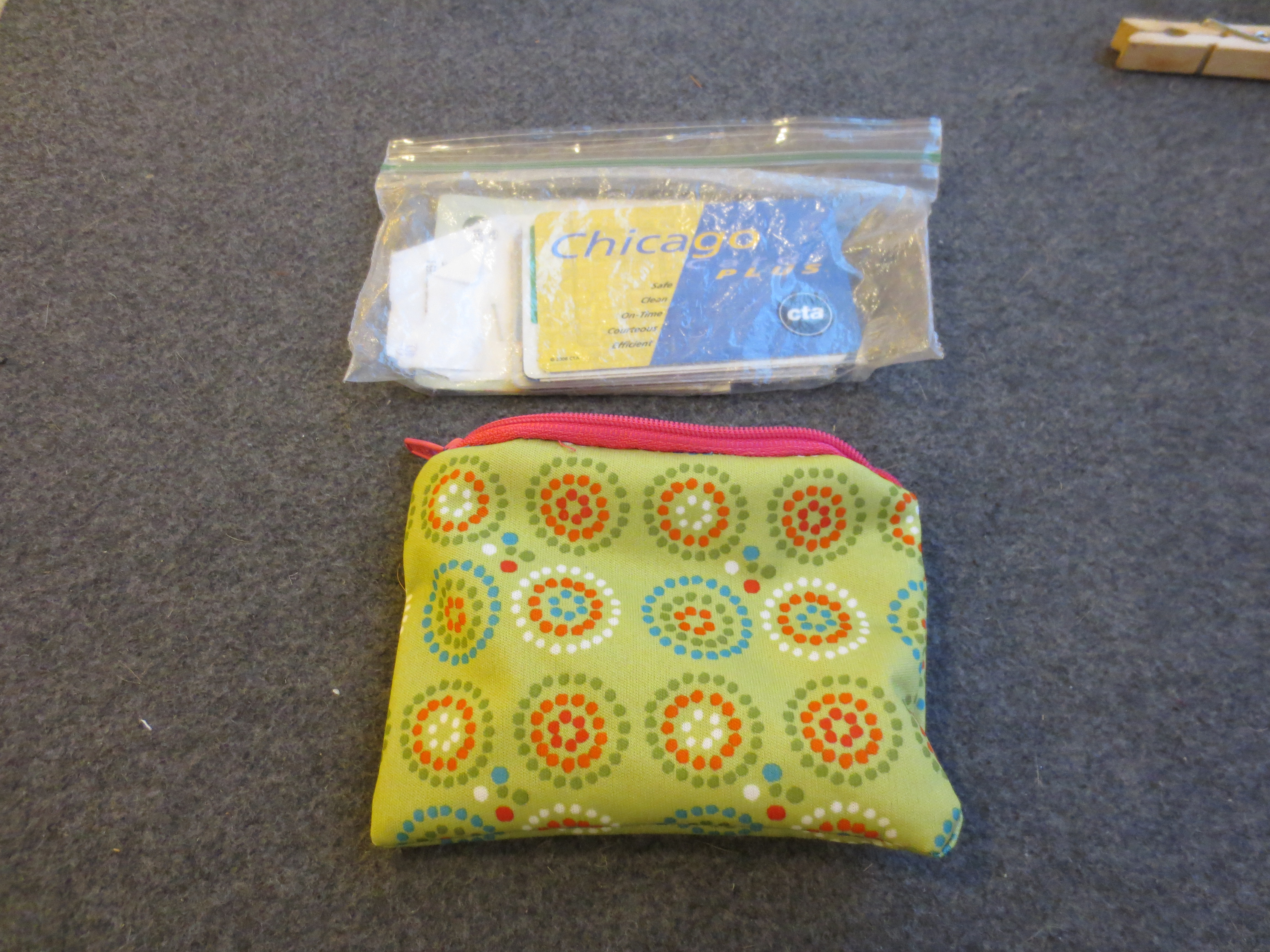 I’d quickly boiled down my going-out necessities to what I could fit in my coat pocket: phone, keys and wallet. Then, as if sensing that my life was getting too easy, my wallet broke! The coin-purse end spilled its innards– coins, a band-aid, a bike tire valve adapter, some string and a piece of gum – all over the floor at Aldi.