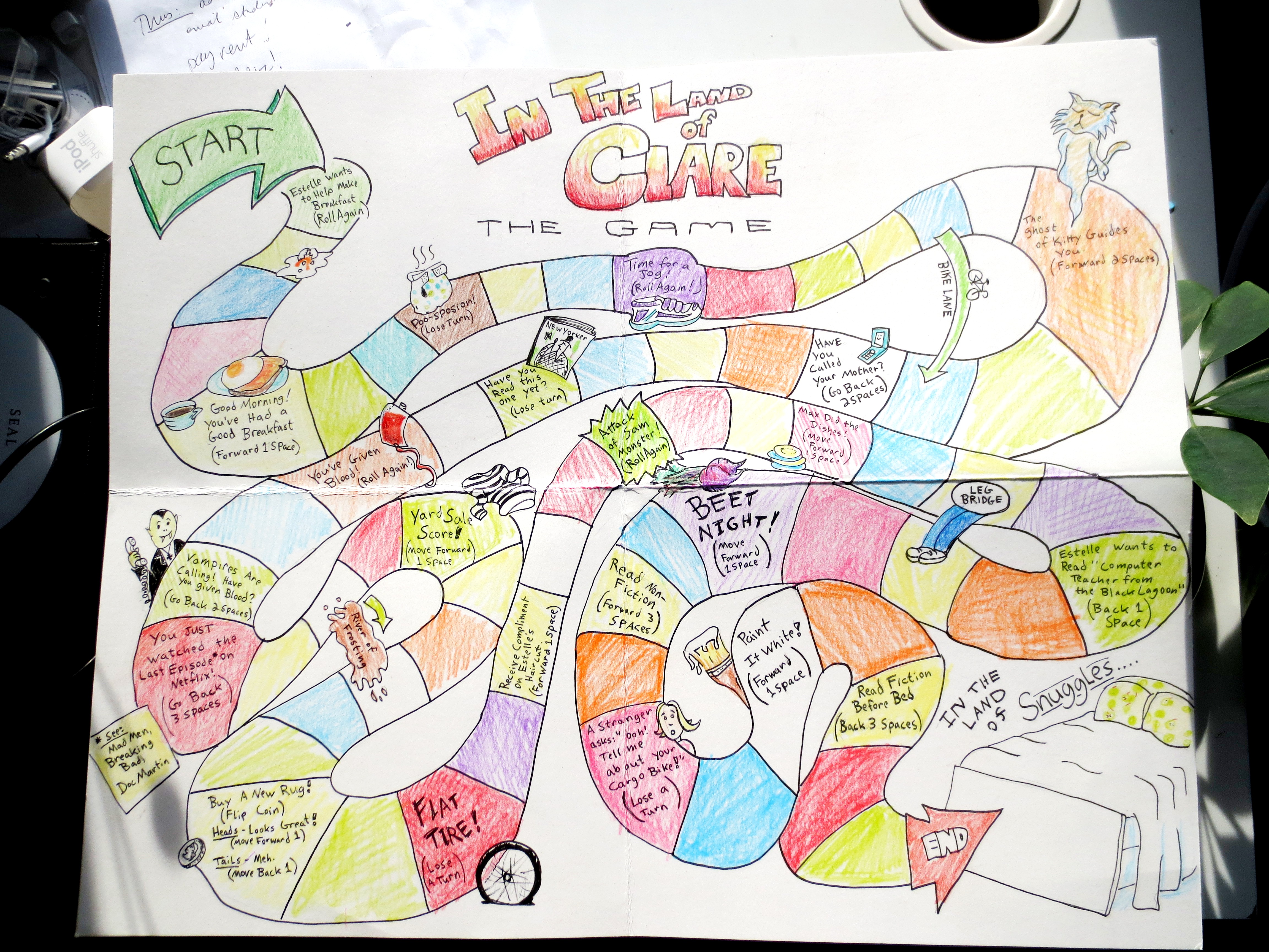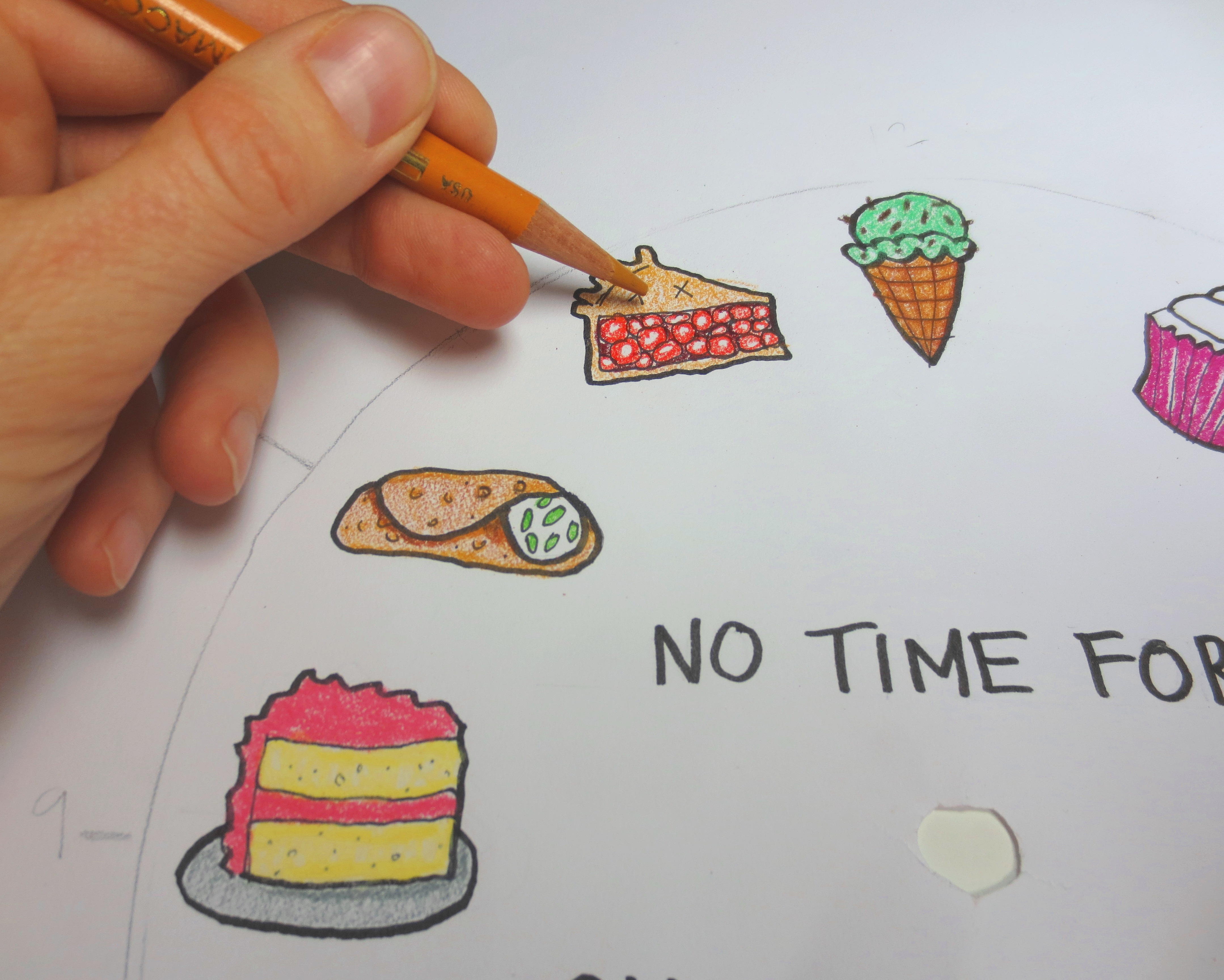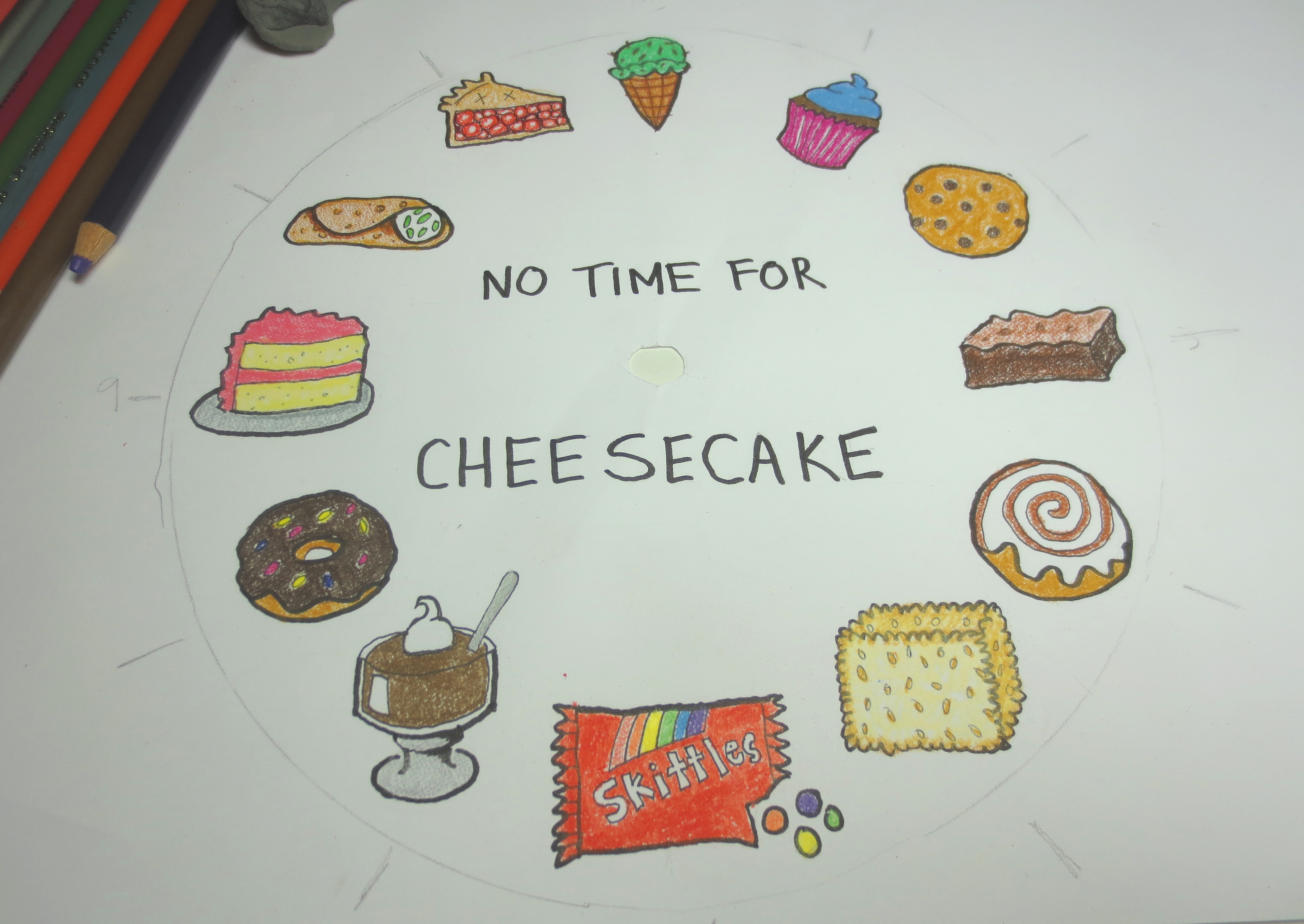 It is important to decide in advance how many desserts you will create. For example, can you only think of four desserts that you love more than cheesecake? Then maybe you should place them at 12, 3, 6 and 9 o’clock. I planned for all 12 hours, but got stuck after ten. I tried to draw Flan, but it ended up looking too much like a runny hat on a plate. I dug a little deeper and found Pudding and Cannoli. Sure hope my friend likes them more than cheesecake!