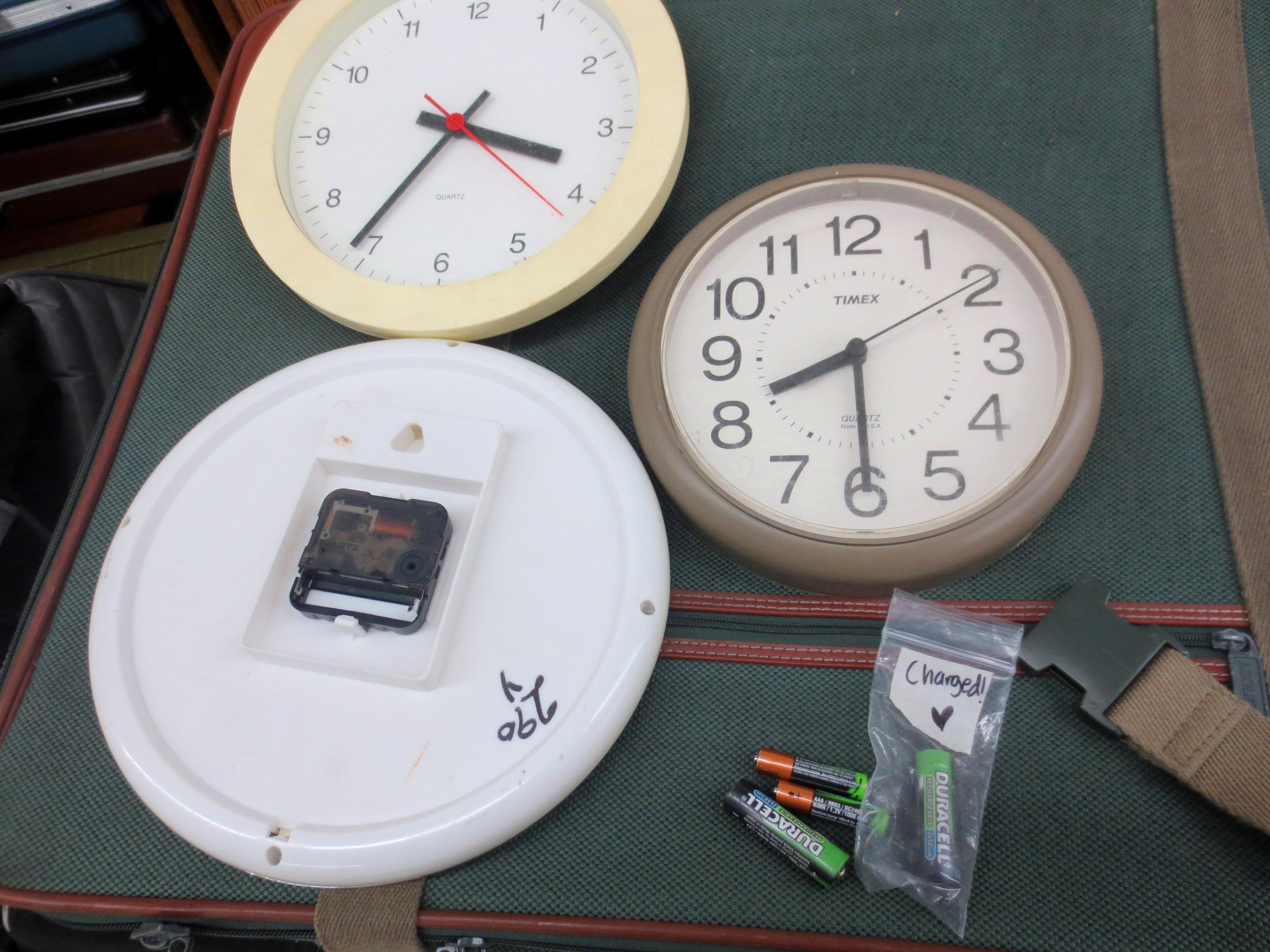 PRO-TIP! Before you leave for the thrift store, slip at least one working AA battery in your pocket. You can’t tell if a clock works just by looking at it. Move your clocks into a discrete corner of the thrift store (like on this pile of old suitcases) and test them using your AA battery. All three worked!