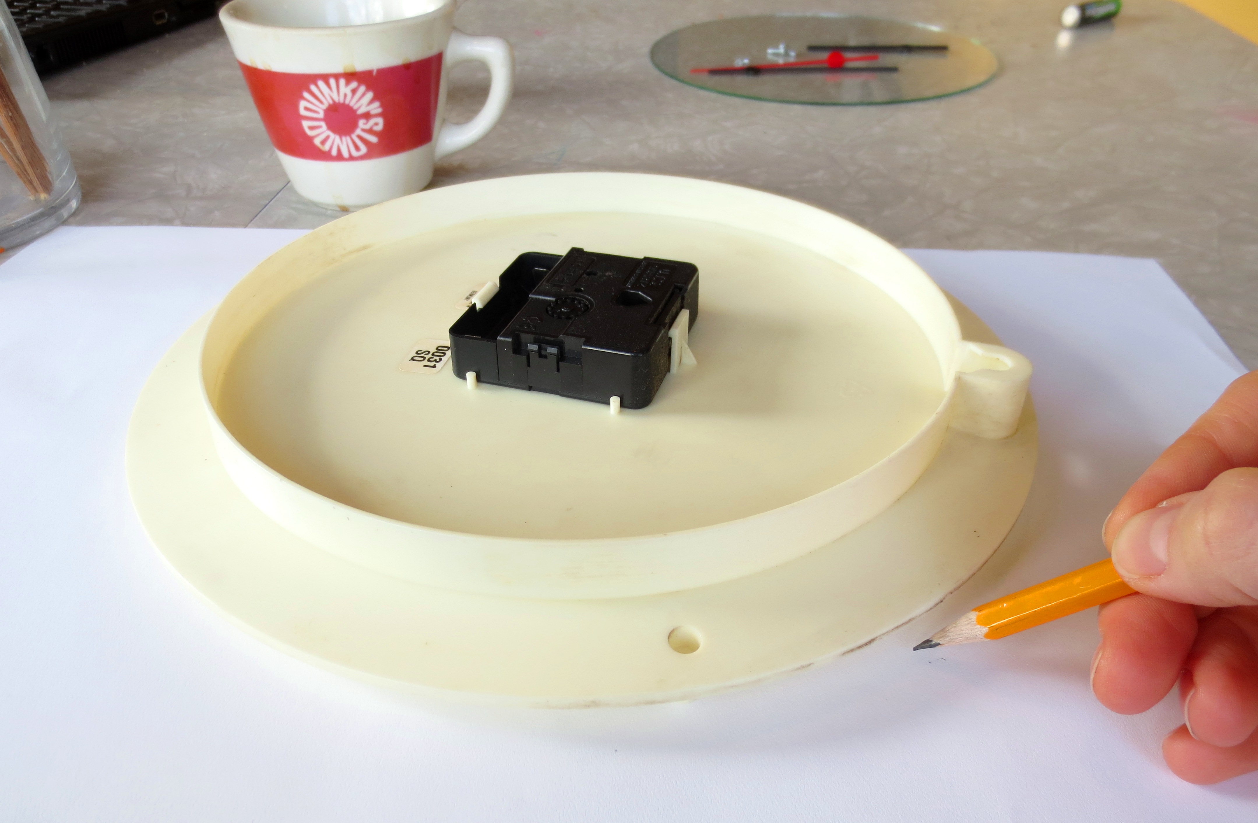 Flip your clock face down and trace the outline of your clock face on a piece of acid-free archival quality art paper, or just steal some copy paper from your office (I can make that joke since I work from home). Anything thicker than construction paper might cause the hands to scrape bottom, slowing down time.