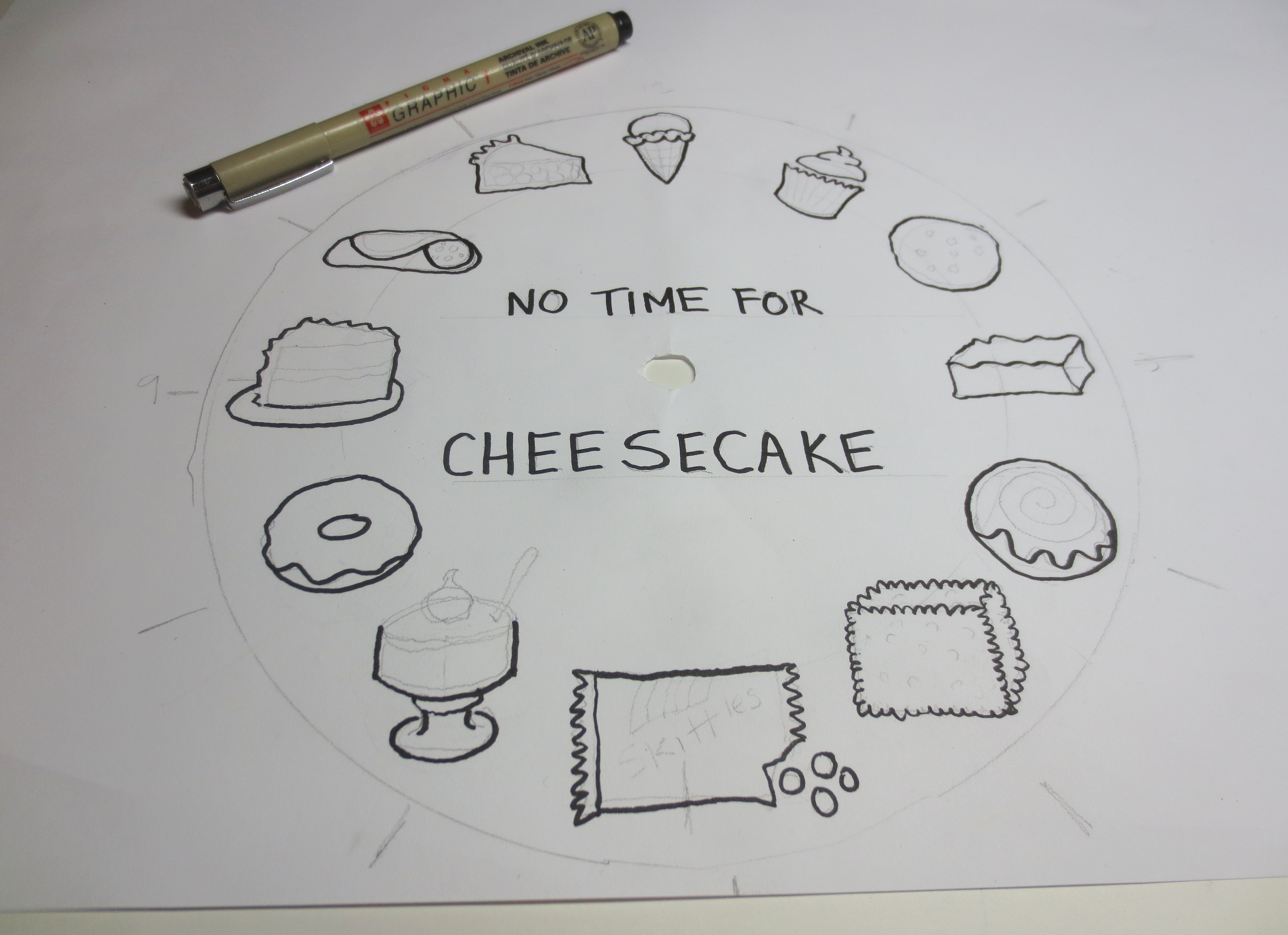 Cut a little hole in the center for the clock hands arm thing (you know what I mean). Then use a small soup bowl to trace an “inner ring” in your clock face. This will give you about a square inch of space to draw your favorite desserts. Use a pencil to mark 12 (or 4) equidistant points on your blank paper to note the location of each dessert.