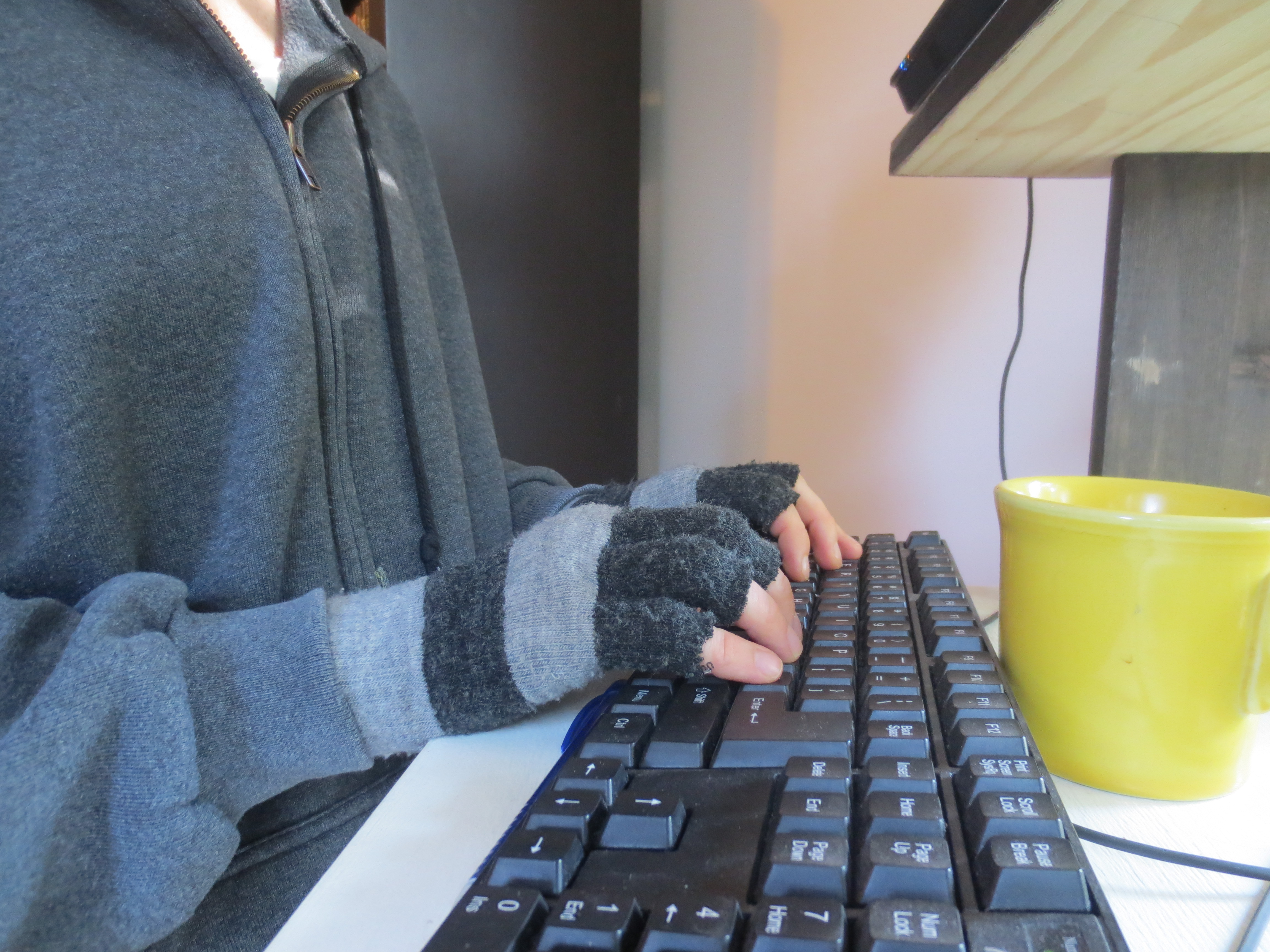 In the winter, you don’t want to heat the whole house just to keep your three square feet of workspace warm. If your electronic devices aren’t keeping you toasty enough, consider cutting the tips off your least-favorite pair of gloves for additional warmth, without any loss of dexterity.