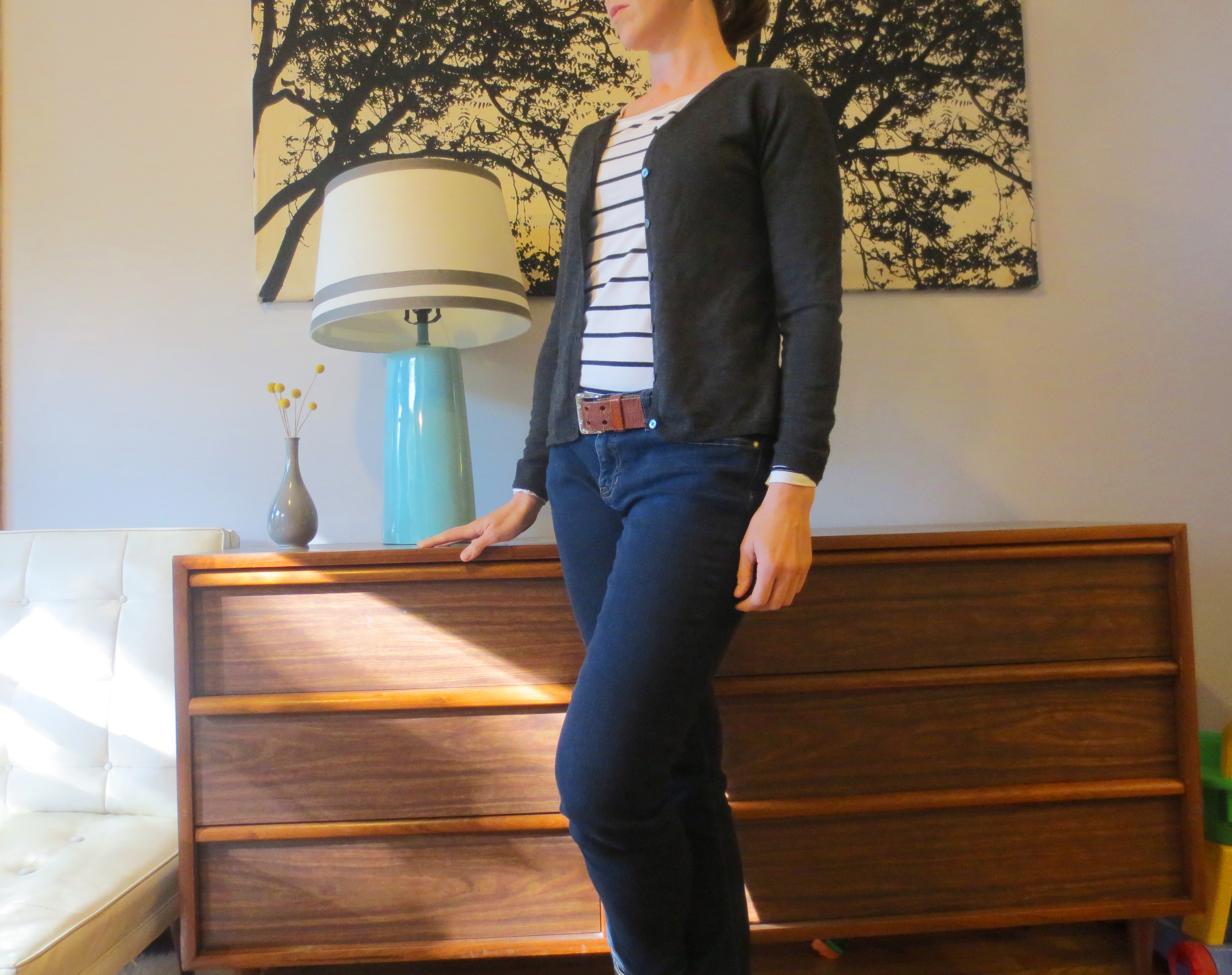 6) Swap out your sweatpants for something on the other end of the comfort spectrum, like jeans. I’ve learned that “skinny” jeans, while a questionable style choice for some, actually hold their shape quite well after days or weeks without being laundered due to their high level of elasticity. Use the same washcloth from Step #2 to dab away any visible stains.