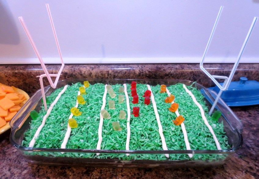Picture 1129 Published April 11, 2013 at 3109 × 2157 in Picture 1129 Cake for our “I don’t give a shit about football” Super Bowl Party, with green dyed coconut grass and gummy bears